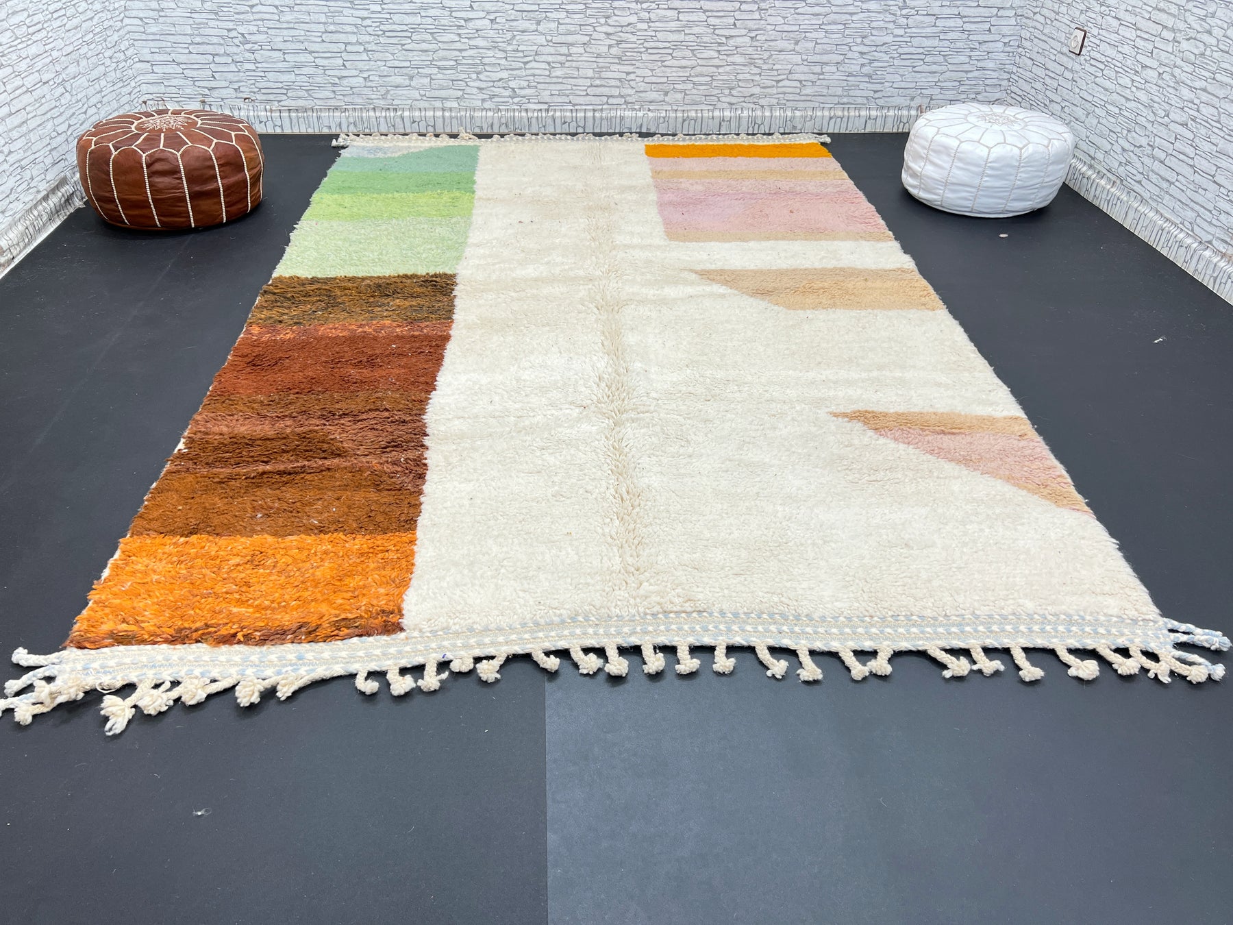 This one-of-a-kind Moroccan wool rug features a stunning color block pattern with earthy shades of green, orange, beige, and blush pink, representing the Moroccan landscape’s harmony between desert tones and natural beauty. Its soft pile and high-quality wool make it both durable and cozy, perfect for living rooms, bedrooms, or artistic interiors.