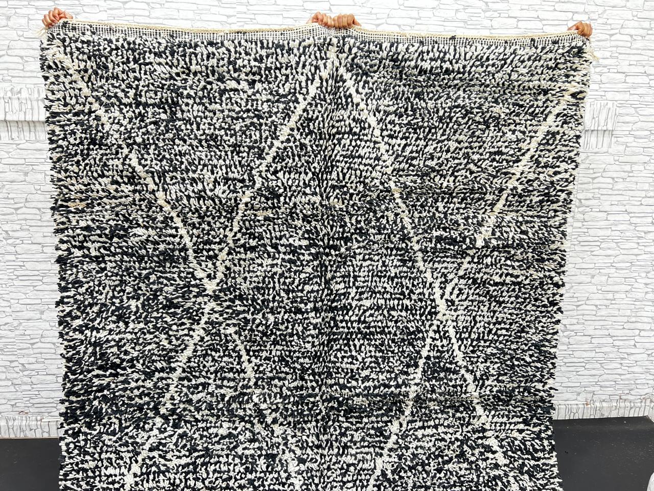 This Black and Cream Diamond Moroccan Wool Rug is a luxurious handmade piece crafted from 100% natural sheep wool by skilled Berber women in the Atlas Mountains of Morocco.