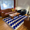 Handwoven by skilled Berber women in the Atlas Mountains, this rug is crafted from 100% natural sheep wool, giving it a thick, plush texture that feels soft, warm, and luxurious underfoot. The deep cobalt blue waves contrast beautifully with the creamy wool base, creating a vibrant statement piece that instantly elevates any interior.