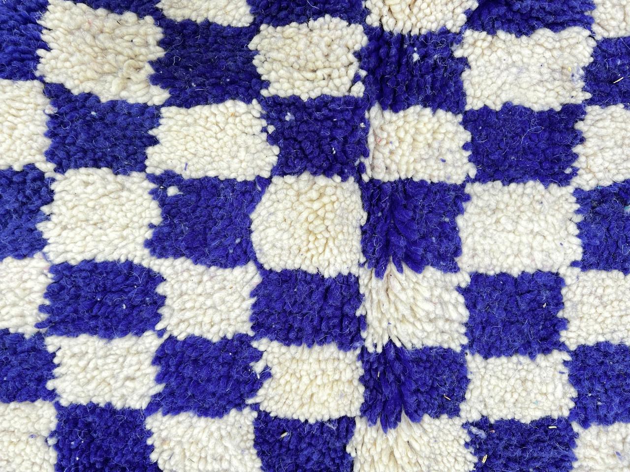 This round Moroccan rug features a bold blue and white checkered pattern that brings a fresh, graphic look to any space. Handwoven from natural wool, this Moroccan wool rug combines traditional craftsmanship with a modern checkerboard design.