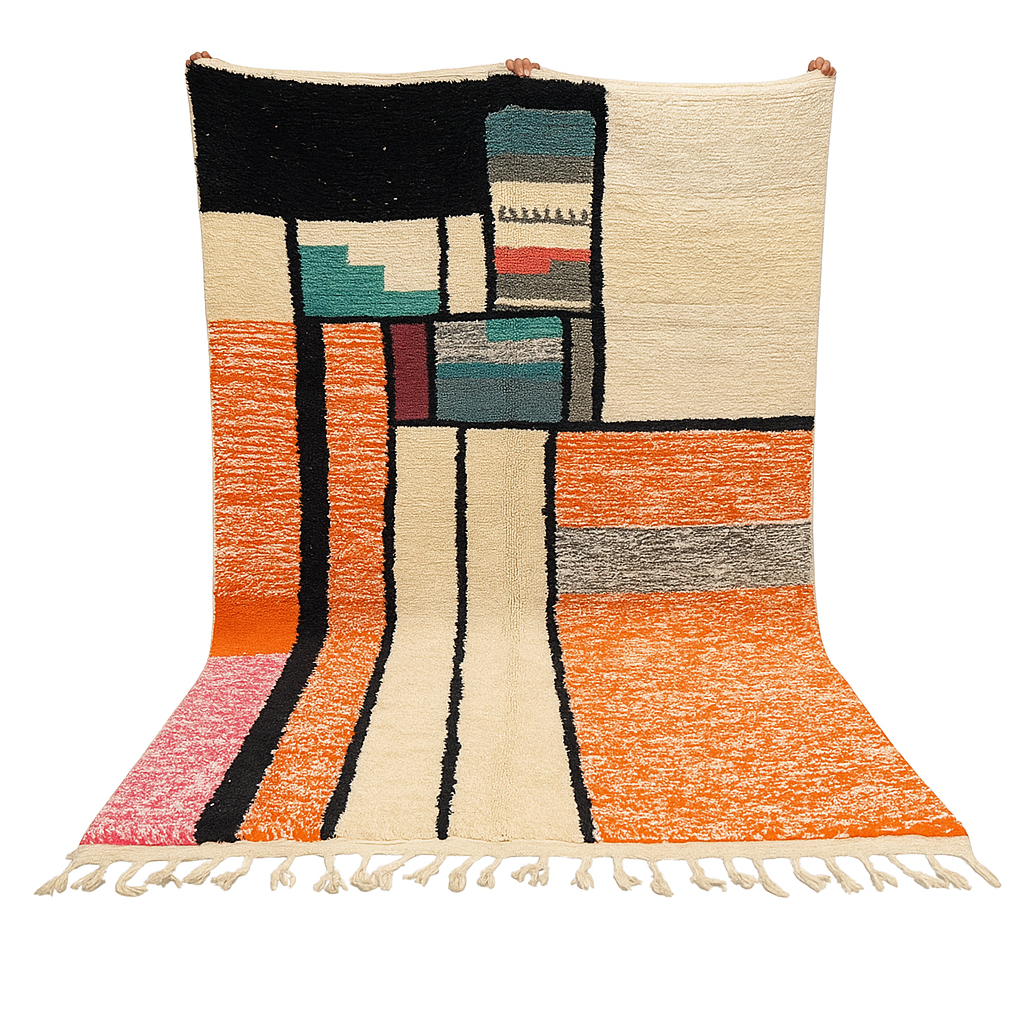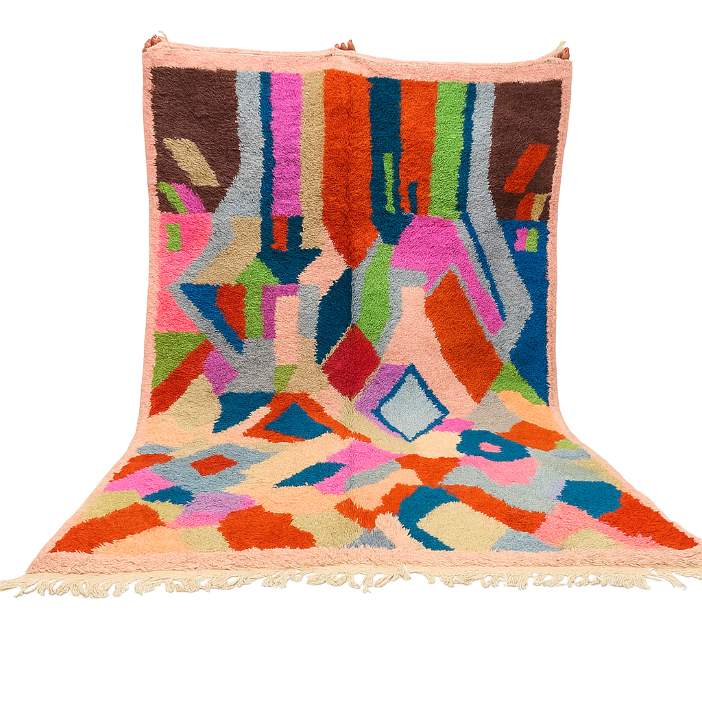 Each Boujaad Moroccan rug is crafted from 100% natural wool and showcases rich, warm colors — from pinks and reds to oranges and greens — woven into abstract geometric designs that tell the story of Moroccan heritage and artistry.