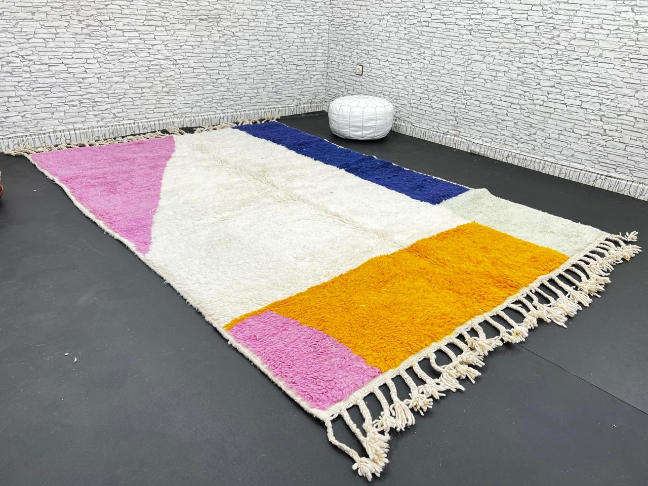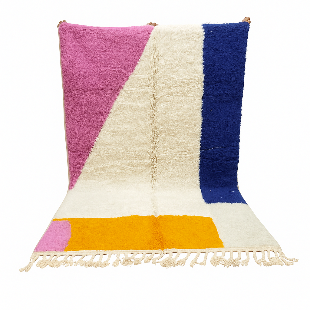 This Colorful Abstract Moroccan Wool Rug is a bold, artistic statement handcrafted by Berber women artisans in the Atlas Mountains of Morocco. Made from 100% natural sheep wool, it features a modern color block design with vibrant pink, blue, yellow, and cream tones that bring life, warmth, and creativity to any interior.