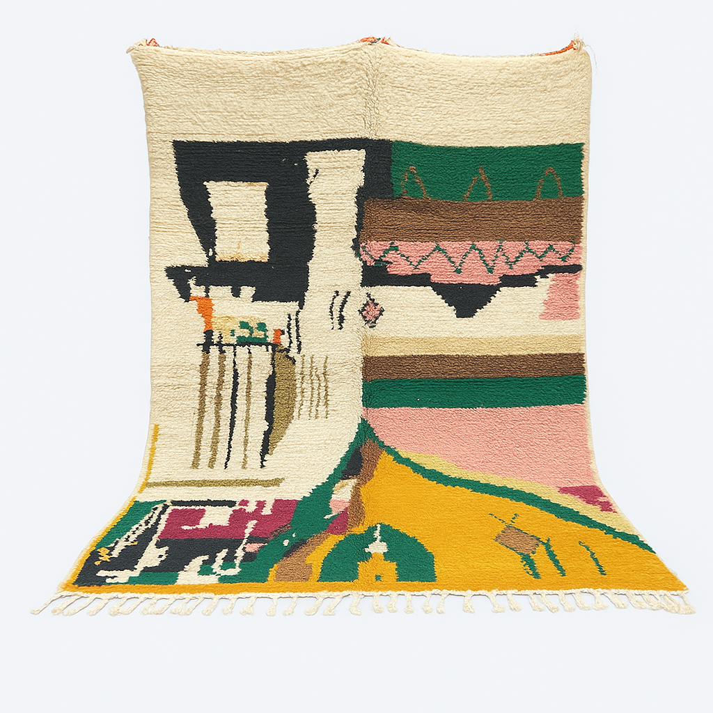 Add an artistic touch to your home with this Colorful Moroccan Wool Rug, a stunning piece of Berber craftsmanship handwoven in Morocco using 100% natural sheep wool. Its abstract composition blends vibrant shades of yellow, pink, green, brown, and black, forming a dynamic design that celebrates Moroccan art and creativity.