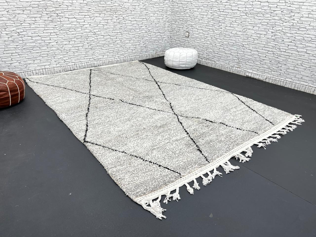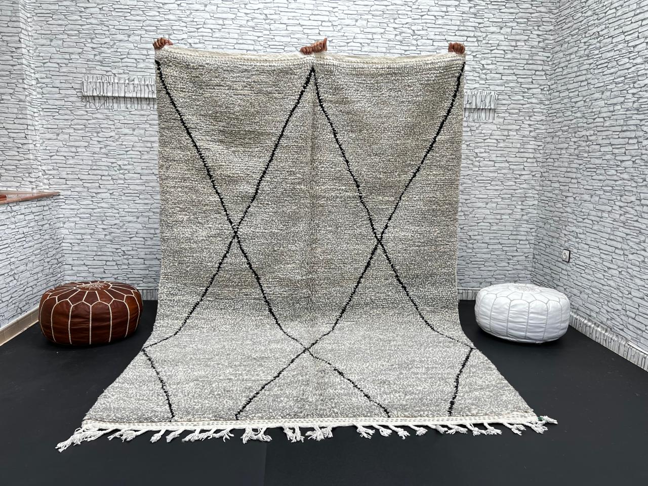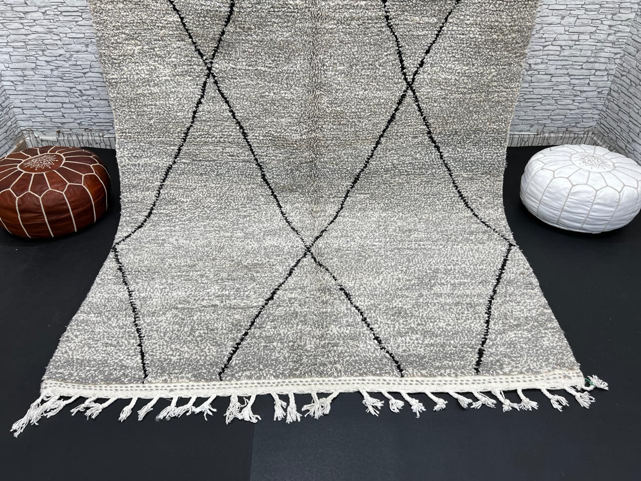 This Gray Beni Ourain Moroccan Wool Rug blends minimalist elegance with authentic Berber craftsmanship. Handwoven by Berber women in the Atlas Mountains, it features a soft gray base with the iconic black diamond pattern, symbolizing harmony and protection in Moroccan culture.