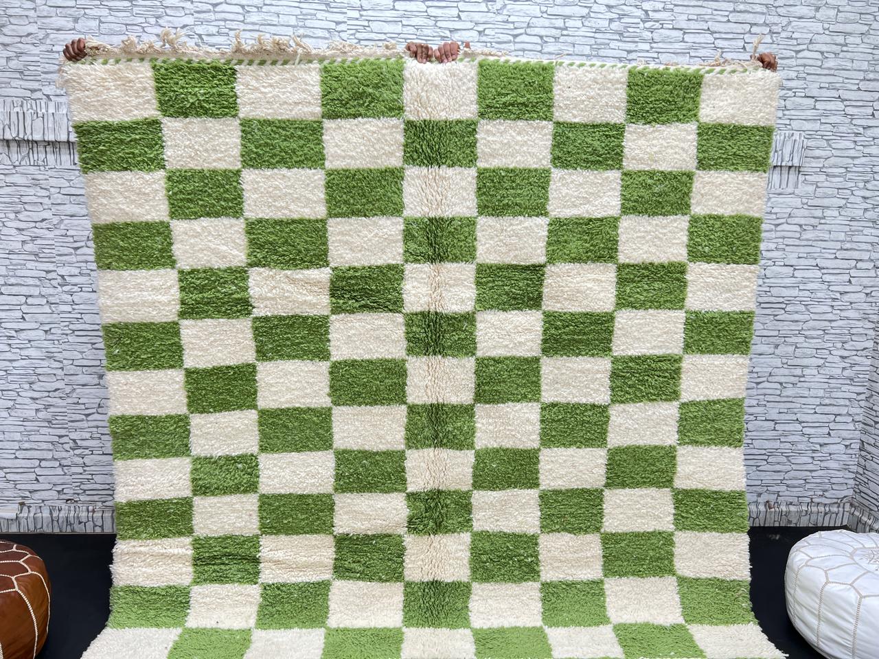 Green and Cream Checkered Moroccan Rug – Handmade Wool Carpet