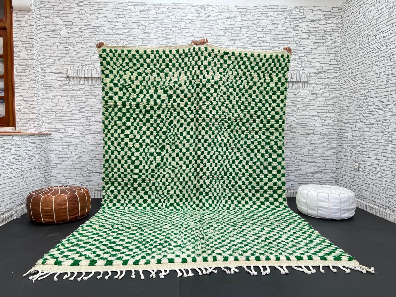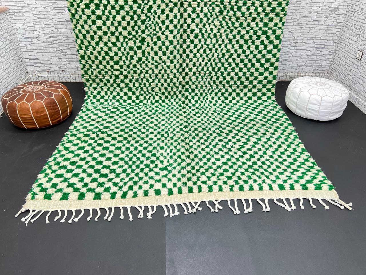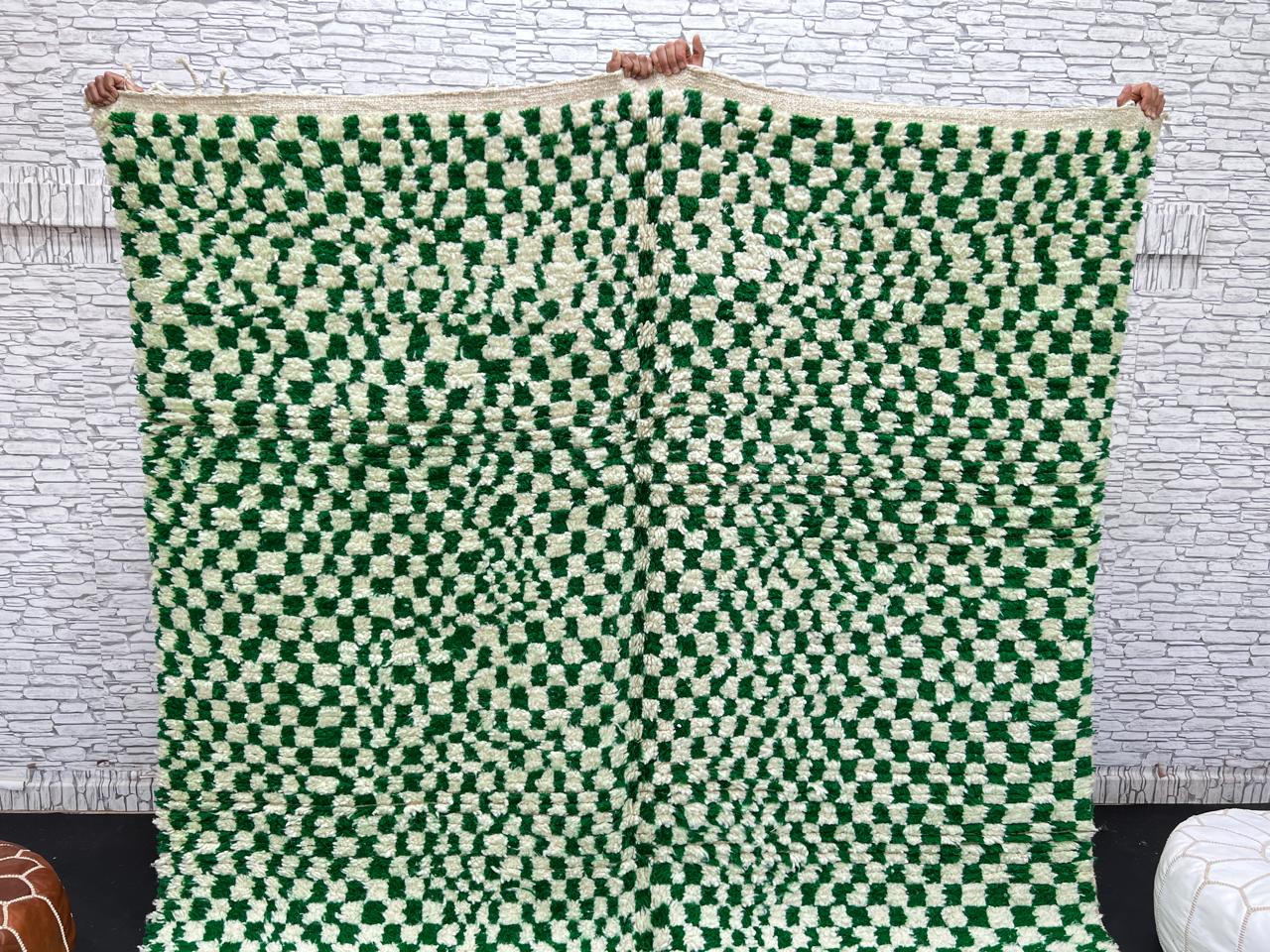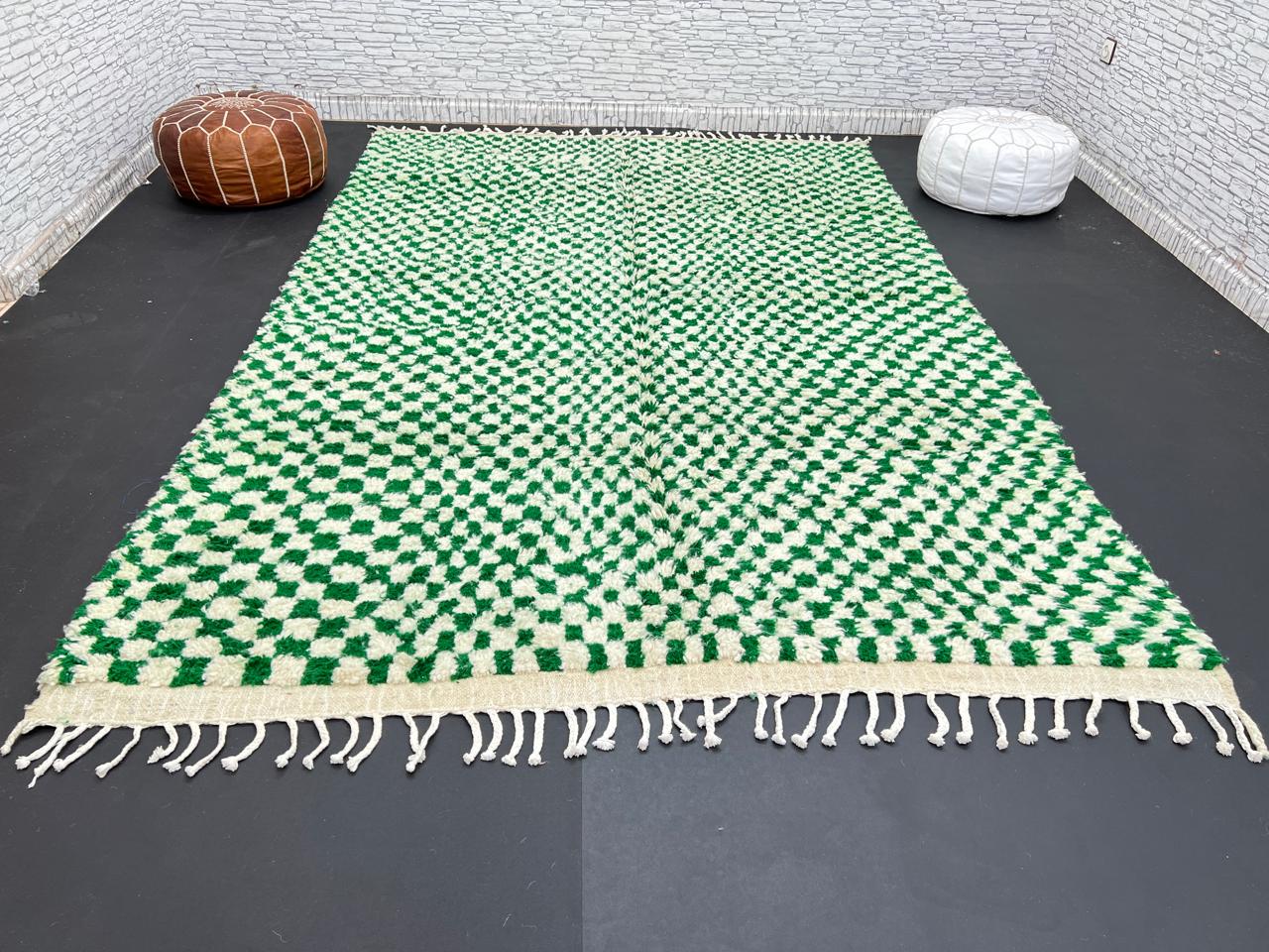 Green and White Checkerboard Moroccan Rug – Handmade Wool Carpet