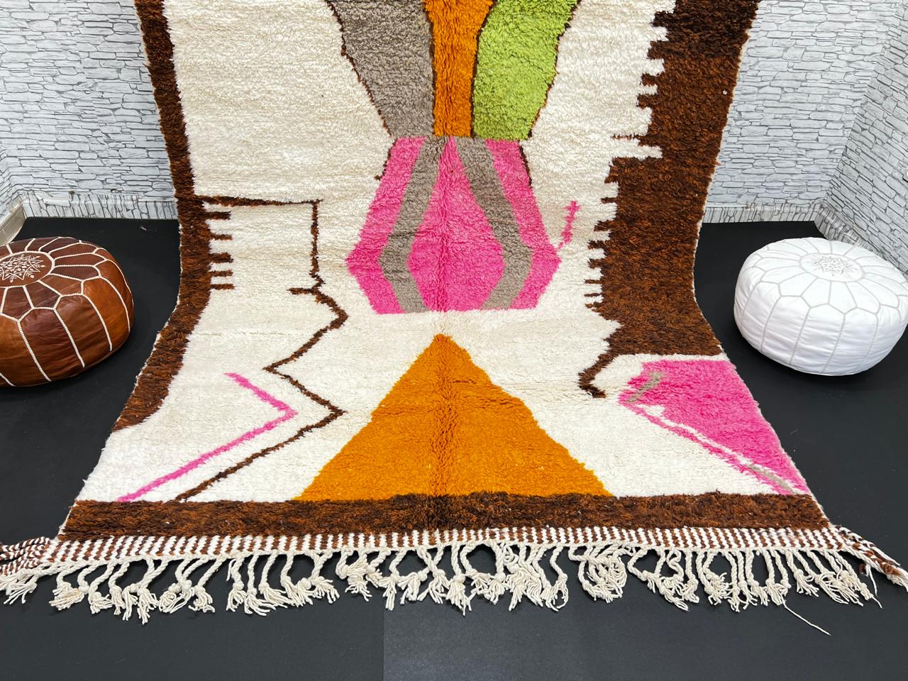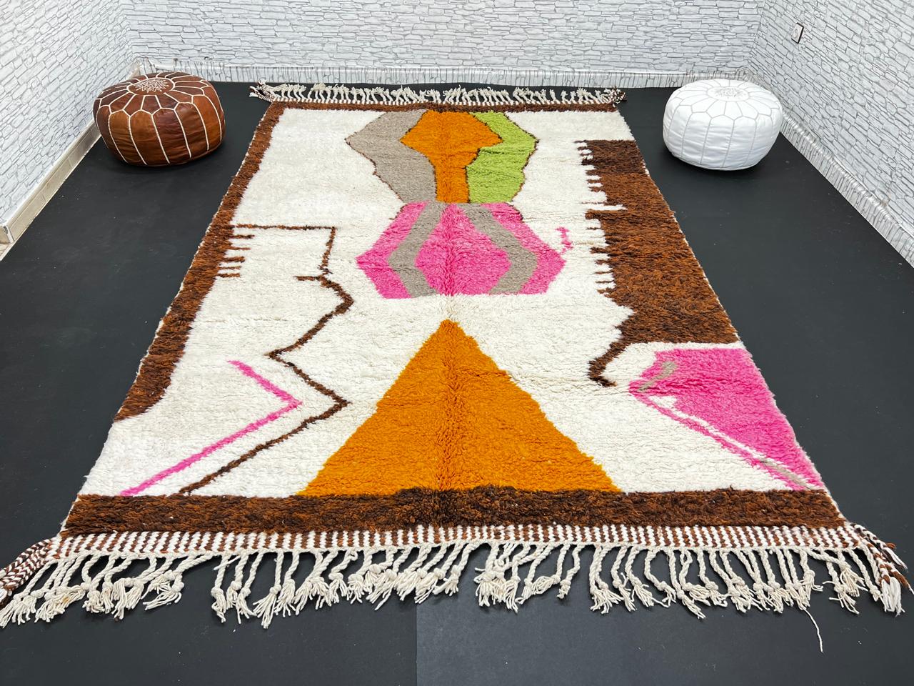 This Modern Moroccan Wool Rug is a striking fusion of tradition and artistic expression. Handwoven by Berber artisans in the Atlas Mountains, this rug features a bold abstract design in earthy brown, bright orange, lime green, and soft pink tones against a natural cream background.