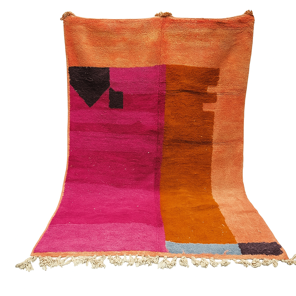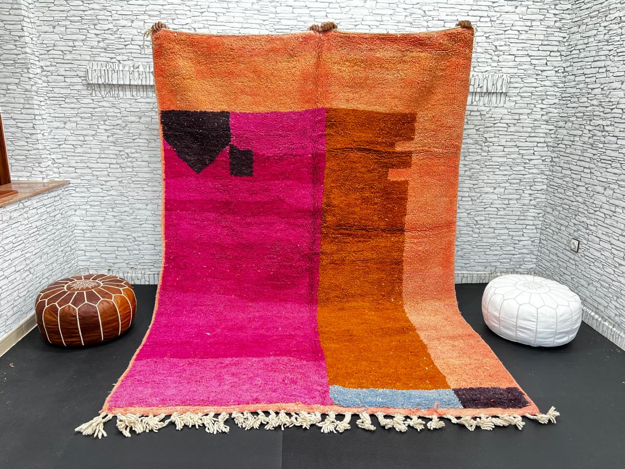 This Moroccan Wool Rug features a bold color block design with deep magenta pink, burnt orange, black, and blue accents — a contemporary reinterpretation of Morocco’s timeless weaving tradition.