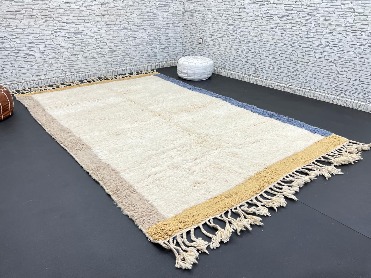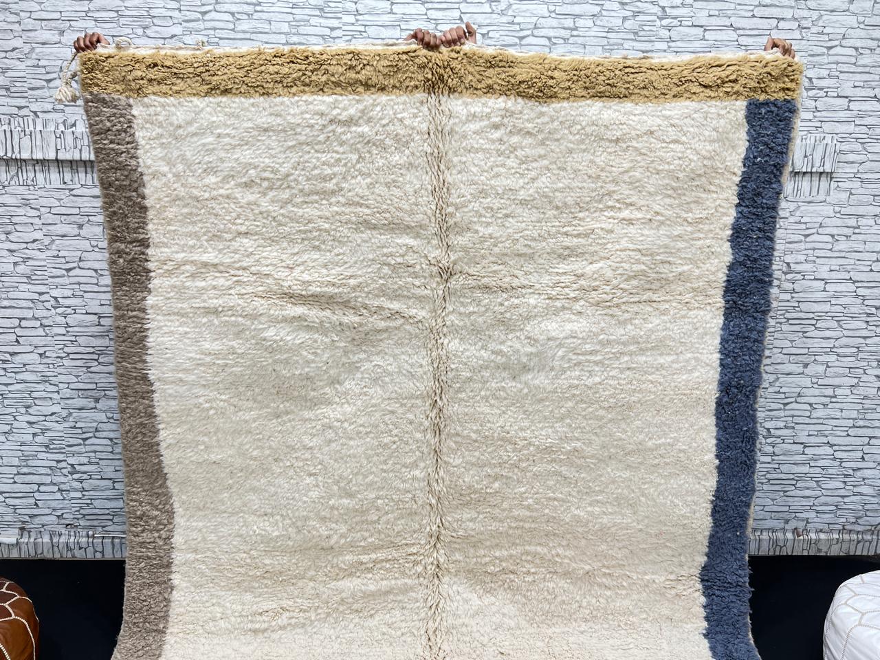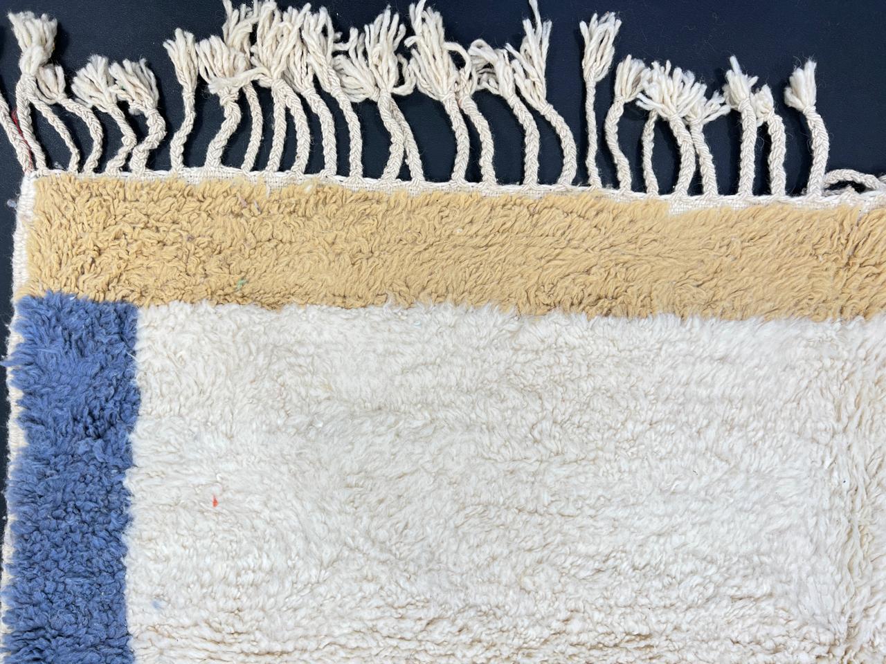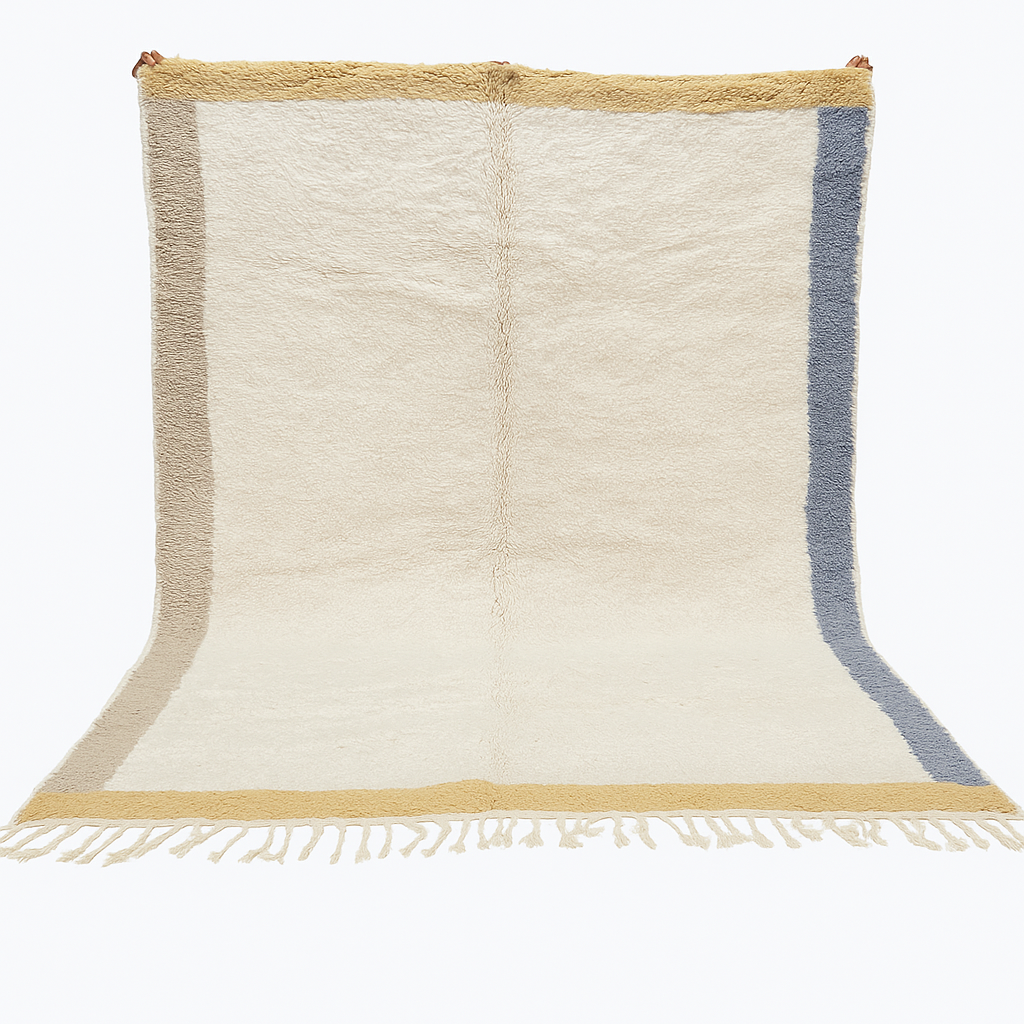 Bring understated elegance into your home with this Neutral Moroccan Wool Rug, handwoven by Berber women in the Atlas Mountains using 100% natural wool. Featuring a refined ivory base framed with beige, mustard, and soft blue borders, this rug perfectly blends minimalist modern style with traditional Moroccan craftsmanship.