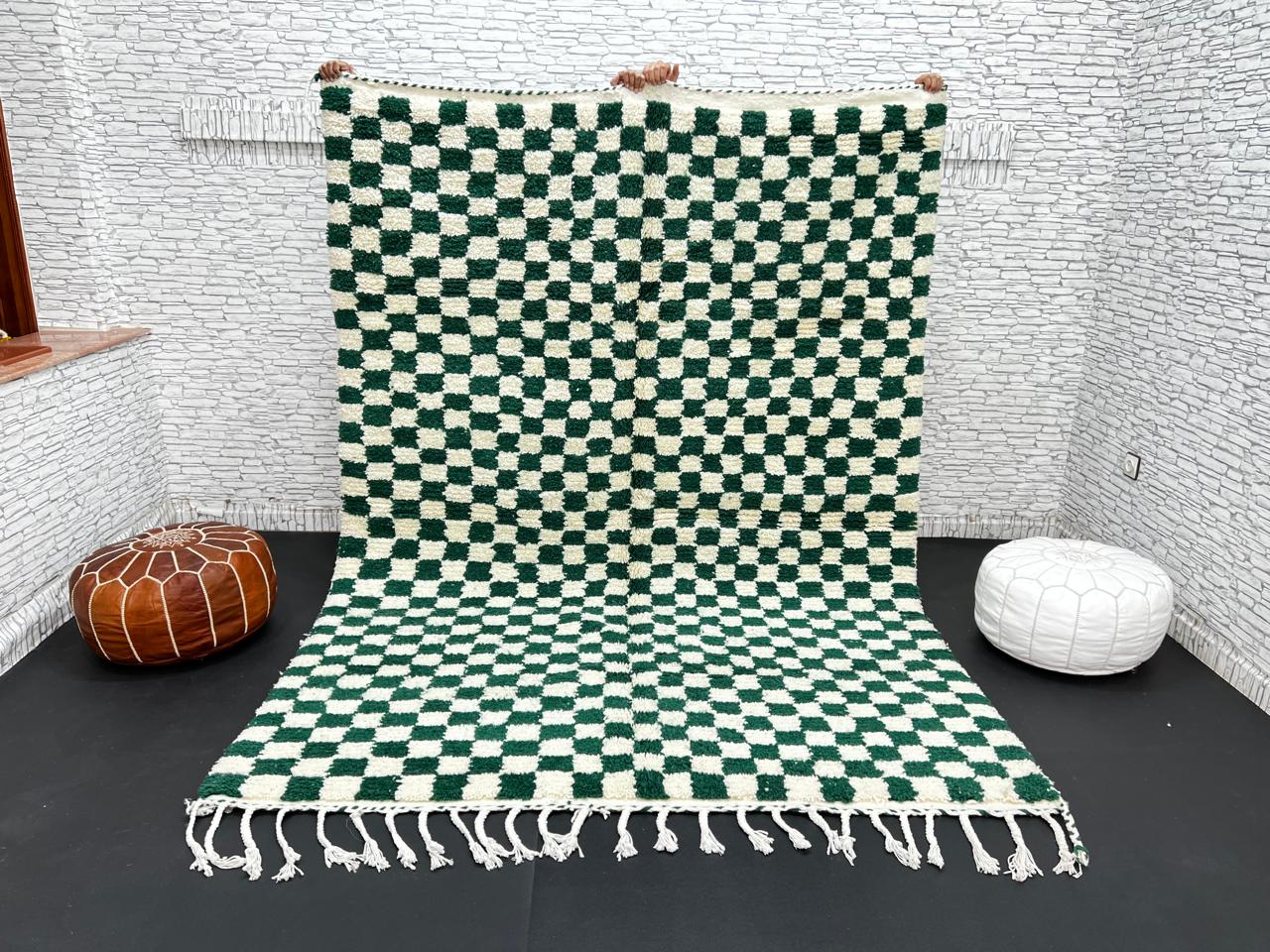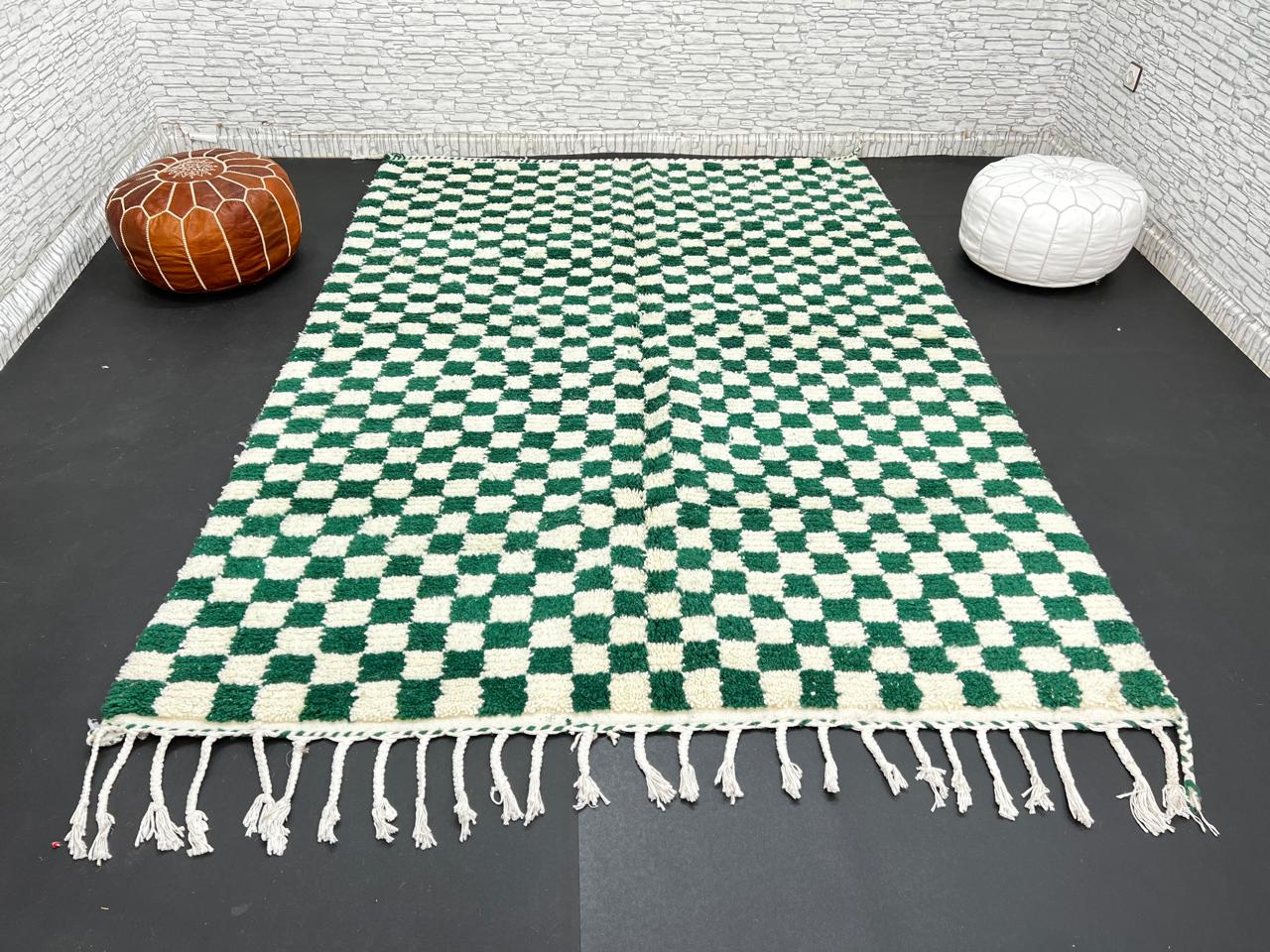 Green and White Moroccan Checkered Wool Rug – Handmade Berber Design