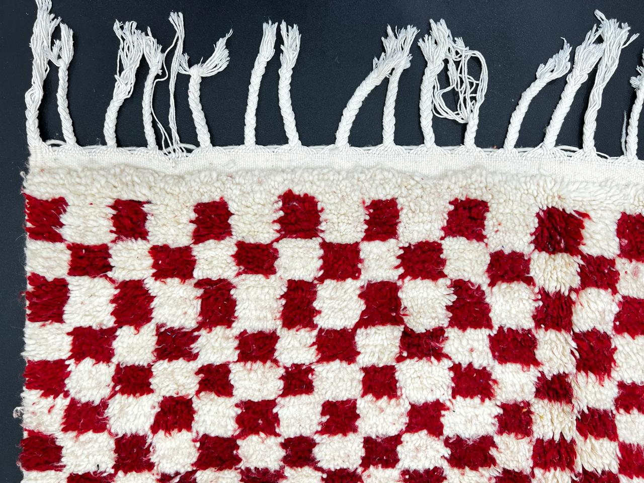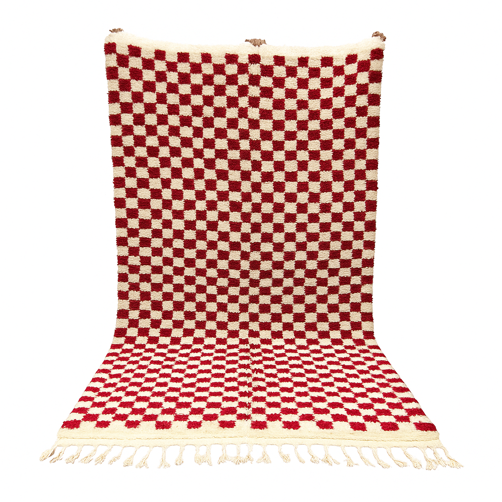 The red and cream checkerboard pattern brings an energetic yet balanced aesthetic, making it the perfect centerpiece for living rooms, bedrooms, or creative spaces. Soft underfoot and incredibly durable, this rug is both artisanal and functional, showcasing authentic Moroccan weaving tradition.