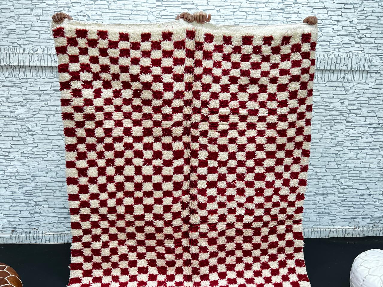 Red and Cream Checkered Moroccan Wool Rug – Handmade Berber Carpet