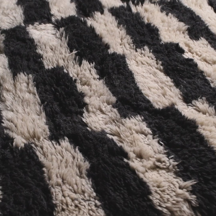This black and white Moroccan rug is a stunning handwoven runner that blends bold design with timeless Berber tradition. Crafted from 100% natural wool, the rug features alternating black and ivory stripes arranged in a striking checker-style pattern, finished with authentic handmade fringes.