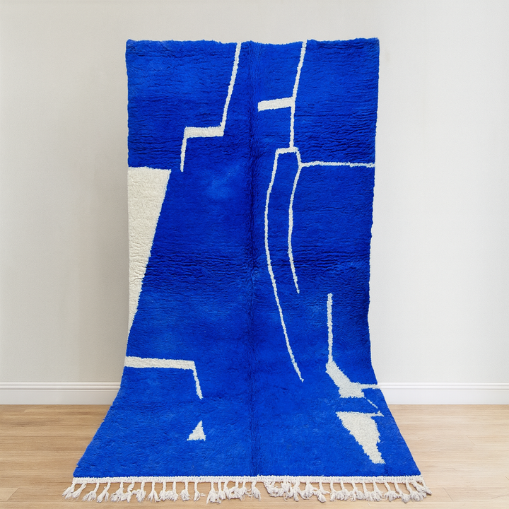 Make a striking statement with this handmade Moroccan wool rug, designed in a vivid cobalt blue with abstract white line accents. Its bold, artistic pattern blends modern design with the authenticity of Moroccan craftsmanship, creating a unique centerpiece for your living room, bedroom, or creative space.