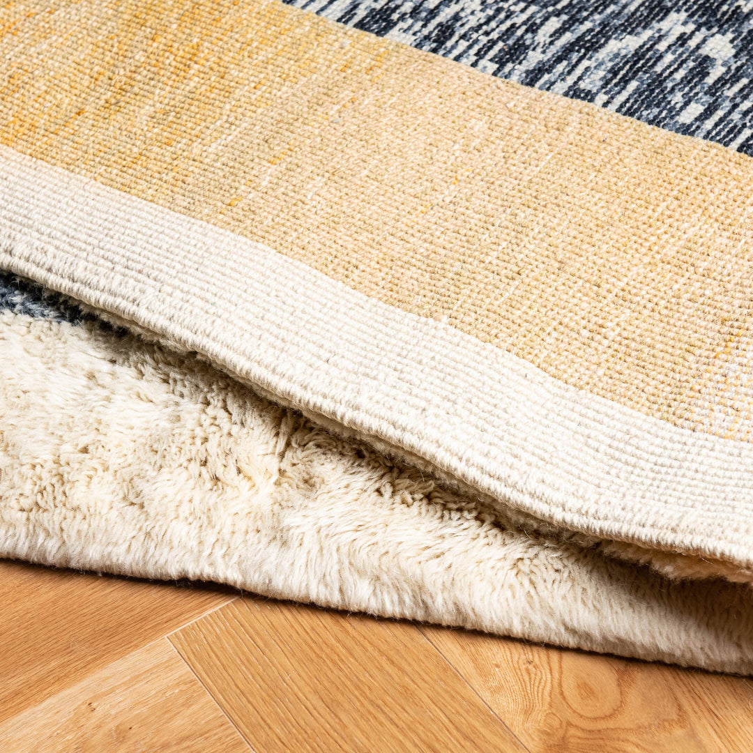 Add color and texture to your space with this Geometric Moroccan Wool Rug, handwoven by Berber artisans using 100% natural wool. This Beni Mrirt wool rug features bold abstract blocks in mustard, clay, charcoal grey, and ivory — perfect for lovers of colorful Moroccan rugs.