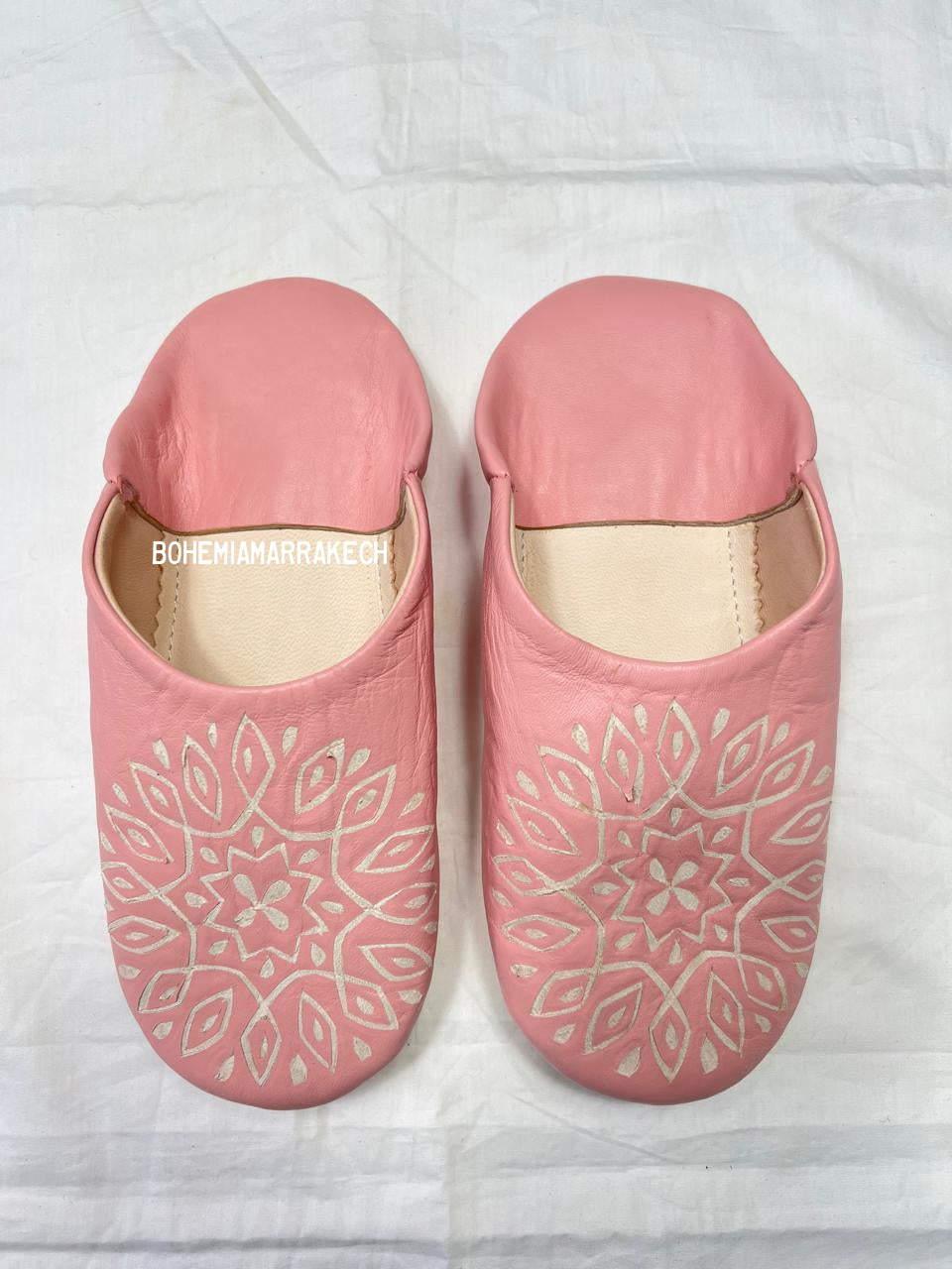 These handmade Moroccan babouche slippers are crafted from soft genuine pink leather and finished with a traditional hand-carved geometric design on the upper.