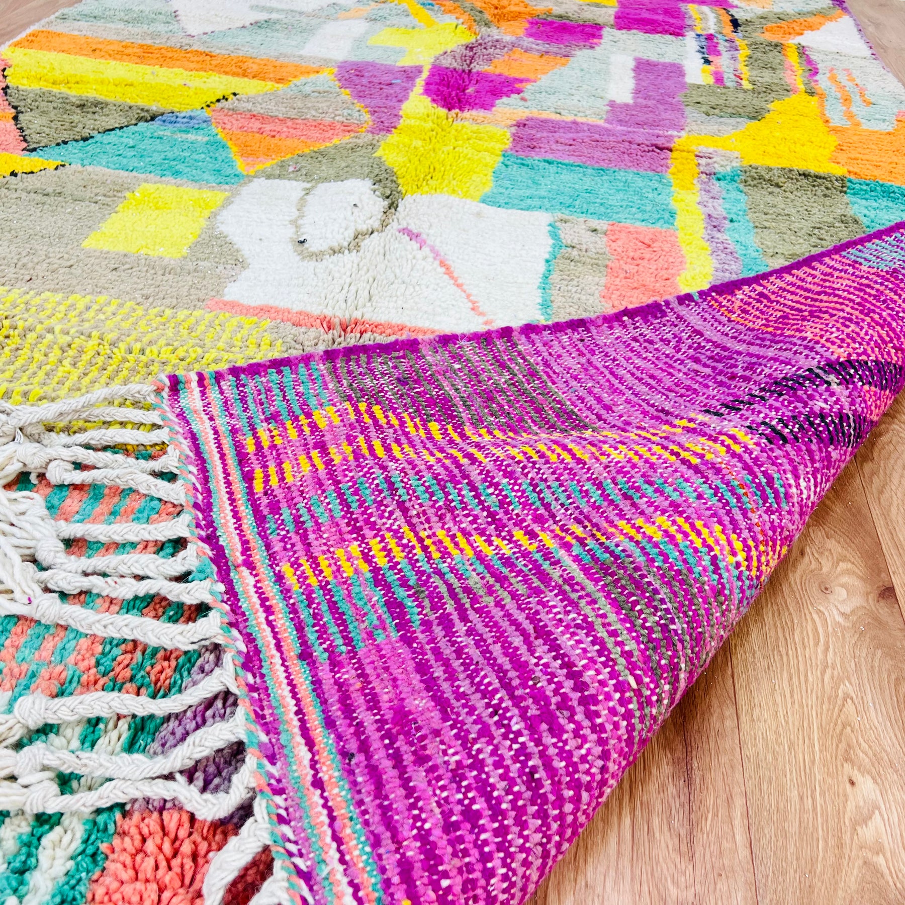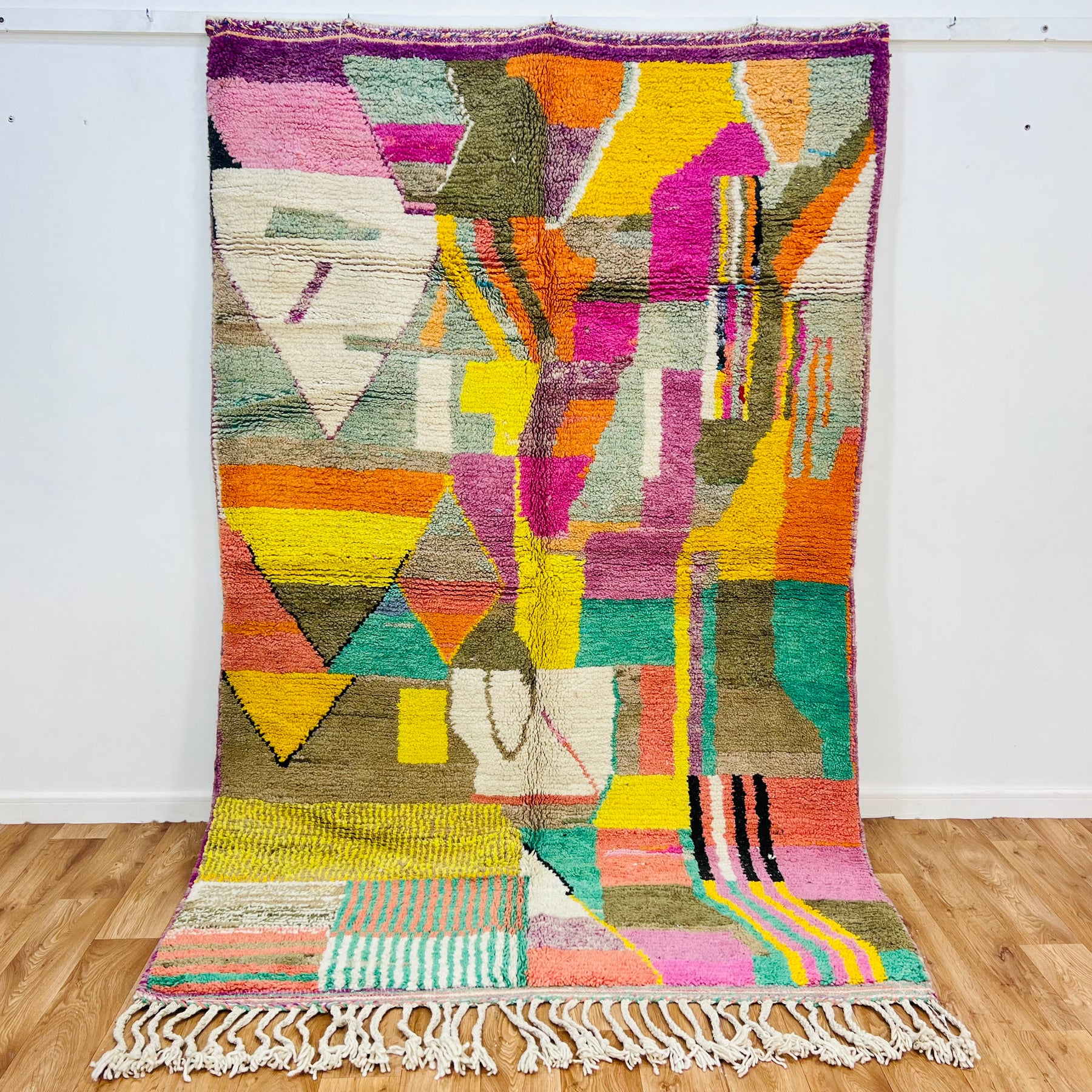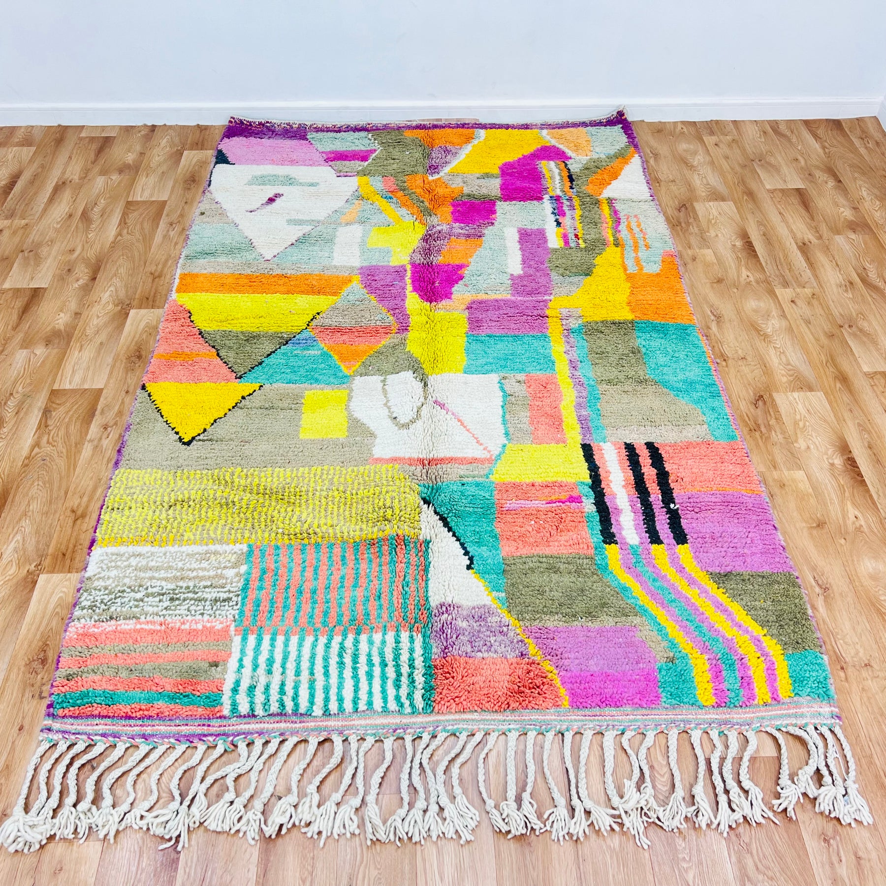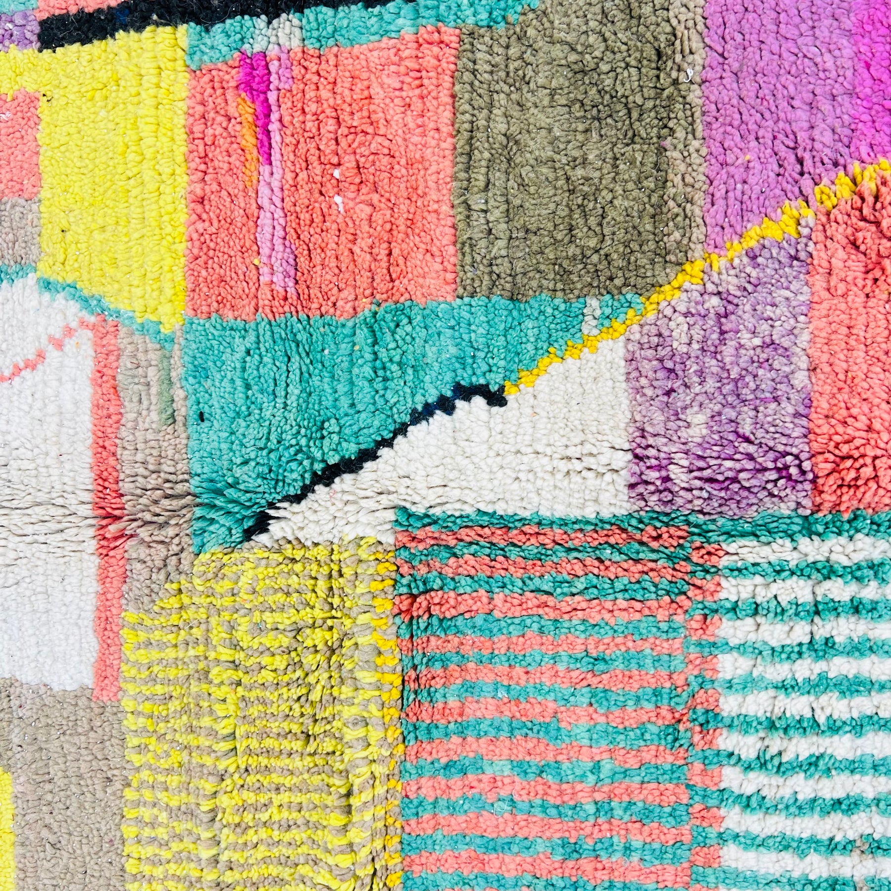 This vibrant Patchwork Abstract Moroccan Wool Rug is a colorful celebration of Moroccan creativity. Designed with an eclectic composition of geometric blocks, linear stripes, and abstract forms in bright yellow, pink, coral, turquoise, green, and earthy tones, it brings joy and movement into any space.