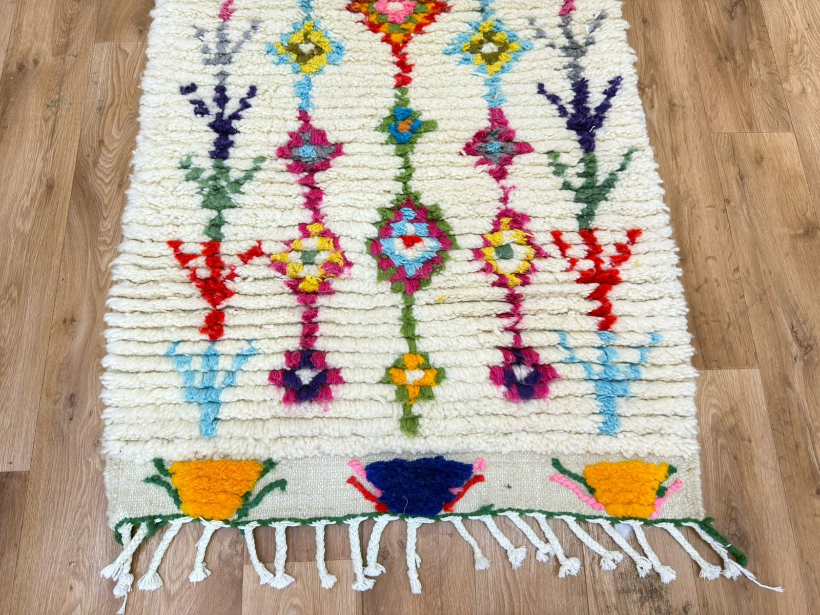 Elevate your space with this Colorful Moroccan Runner Rug, hand knotted from 100% natural wool by Berber artisans. This authentic handmade Moroccan carpet features a cream base with bright tribal motifs in pink, orange, green, blue, and purple, bringing warmth and character to any home.