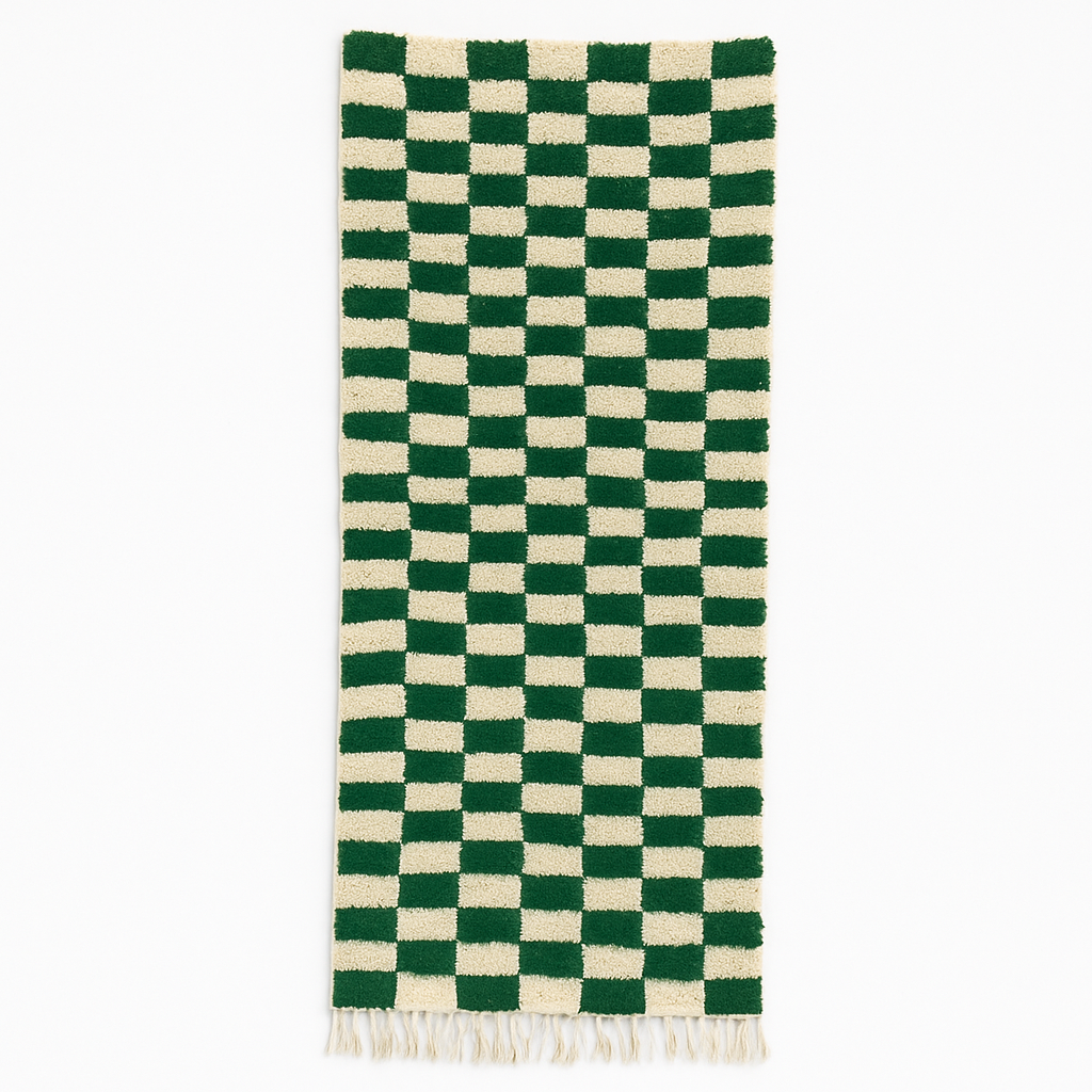 Add bold character and modern charm to your space with this handmade Moroccan checkerboard runner rug, crafted from premium natural wool by skilled Berber artisans. Its striking green and white checker pattern delivers a timeless graphic look that blends perfectly with contemporary, minimalist, boho, and Scandinavian interiors.