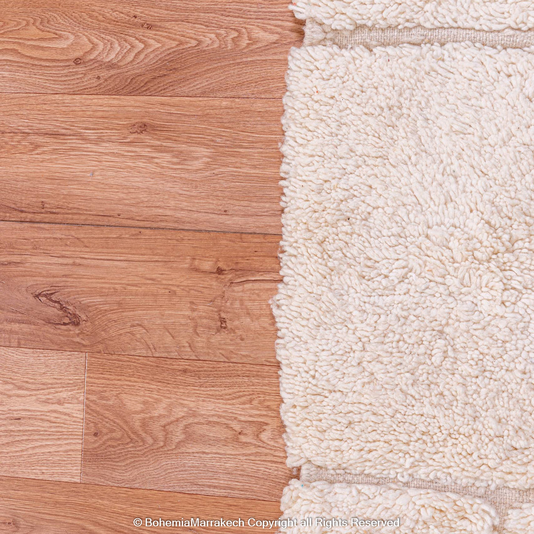 Minimalist Moroccan rug with off-white wool, showcasing Berber craftsmanship and geometric patterns on wooden floor.