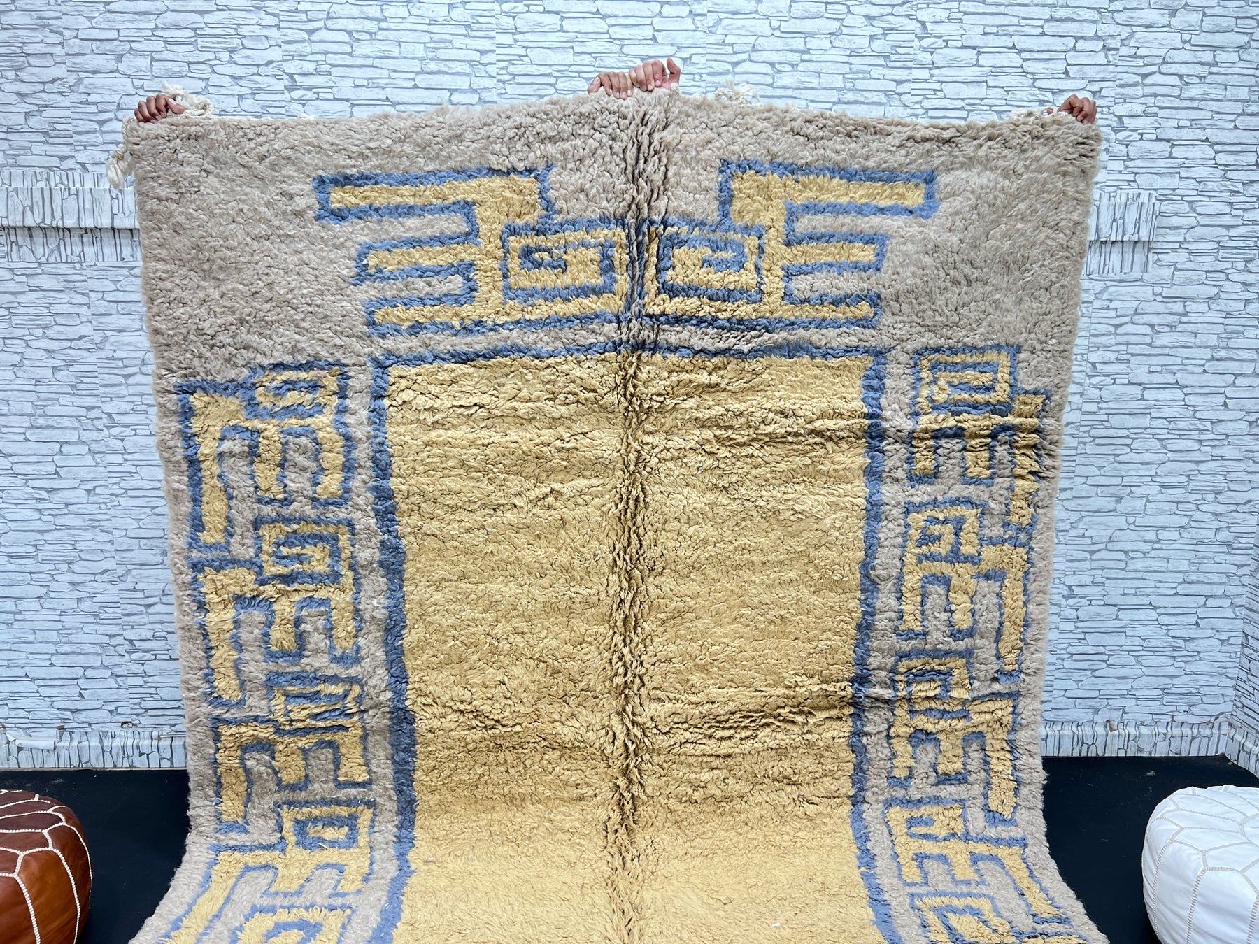 Elevate your space with this Beige and Blue Moroccan Rug, a handwoven wool masterpiece that reflects the perfect balance of tradition and modern artistry. Crafted by Berber women in the Atlas Mountains, this rug features a central beige-golden field bordered with intricate blue geometric patterns reminiscent of ancient Amazigh symbols.