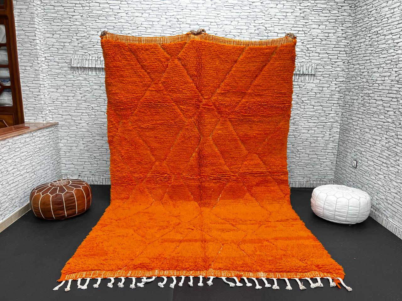 Each rug is handwoven in the Atlas Mountains, reflecting centuries of Moroccan craftsmanship. The burnt orange color adds warmth, energy, and artistic flair, making it ideal for living rooms, bedrooms, or creative studios. Its luxurious wool pile ensures long-lasting comfort and quality.