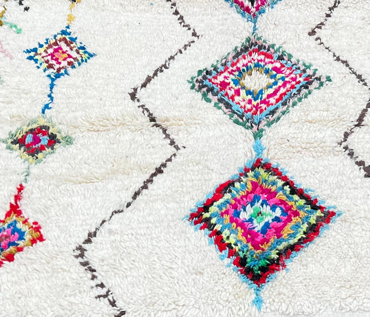 Add vibrant Moroccan artistry to your home with this handwoven wool runner rug, featuring striking multicolor Berber diamond motifs on a clean white background. Each symbol represents traditional Amazigh meanings—protection, strength, harmony, and creativity—turning this rug into a storytelling piece filled with cultural identity.