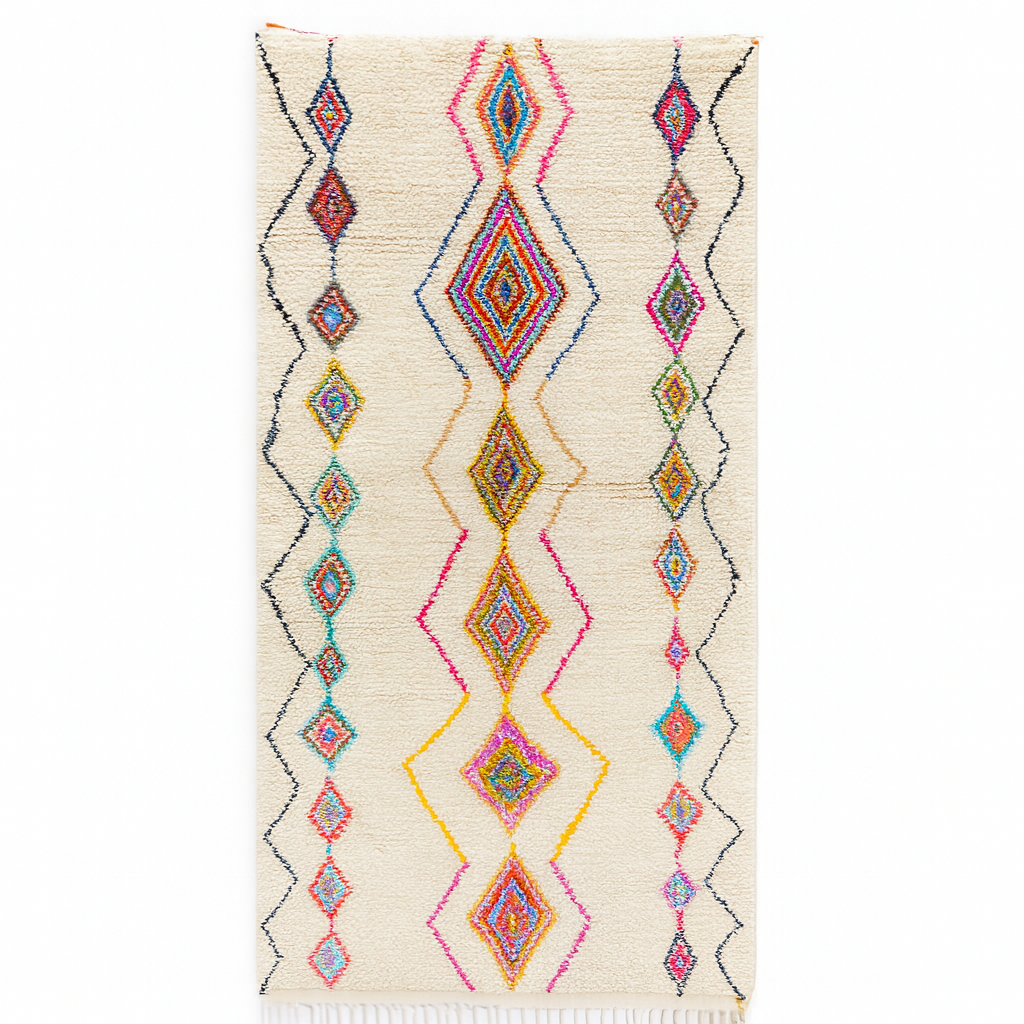 Bring vibrant Berber artistry into your home with this Colorful Diamond Moroccan Runner Rug, a handmade piece woven by skilled Moroccan artisans. The rug features bright multi-color diamond motifs arranged in symmetrical lines on a soft white background, creating a lively and eye-catching aesthetic perfect for hallways, kitchens, entryways, or bedside styling.
