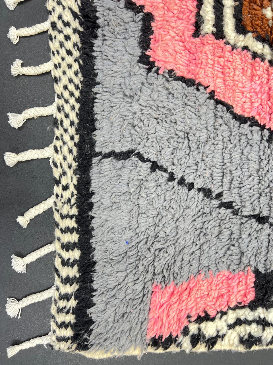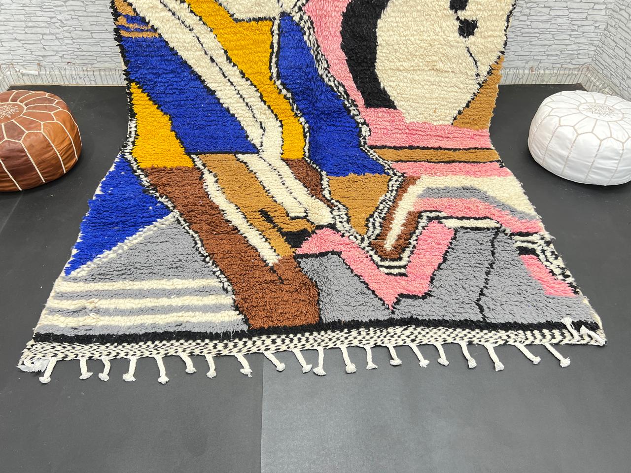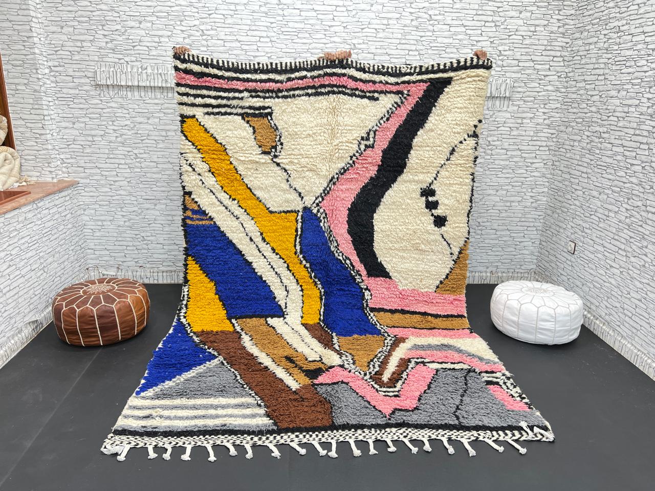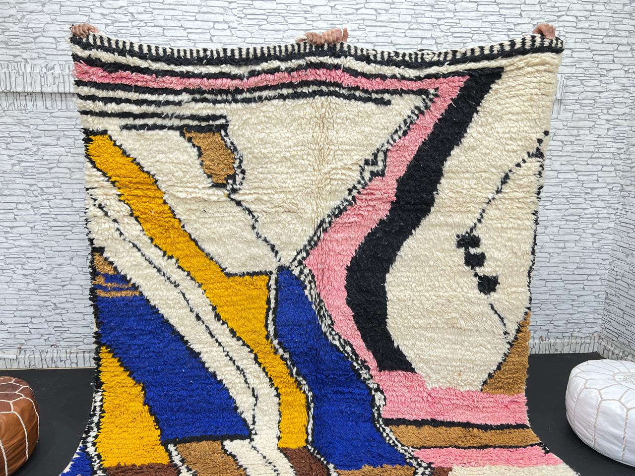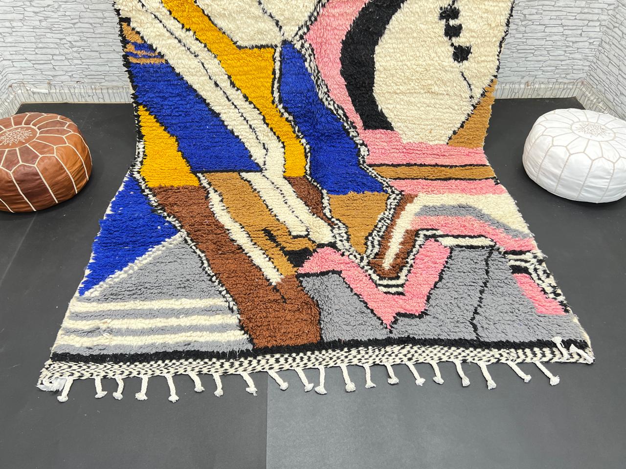 Add a burst of color and artistry to your home with this Colorful Moroccan Wool Rug, handwoven by Berber women in the Atlas Mountains. Featuring a vibrant mix of pink, blue, yellow, black, beige, and brown, this rug captures the energy of modern design while staying true to the soul of traditional Moroccan craftsmanship.