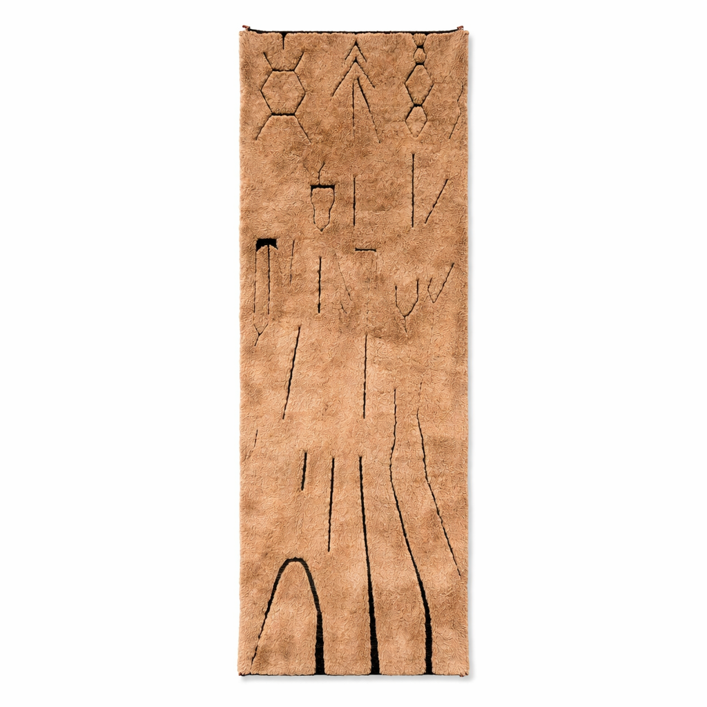 The rug features a warm earthy beige background accented with hand-carved black Berber symbols and linear motifs. The designs are intentionally irregular and organic, giving the rug a raw, artistic character. The subtle carved lines create texture and depth while remaining visually calm and balanced.
