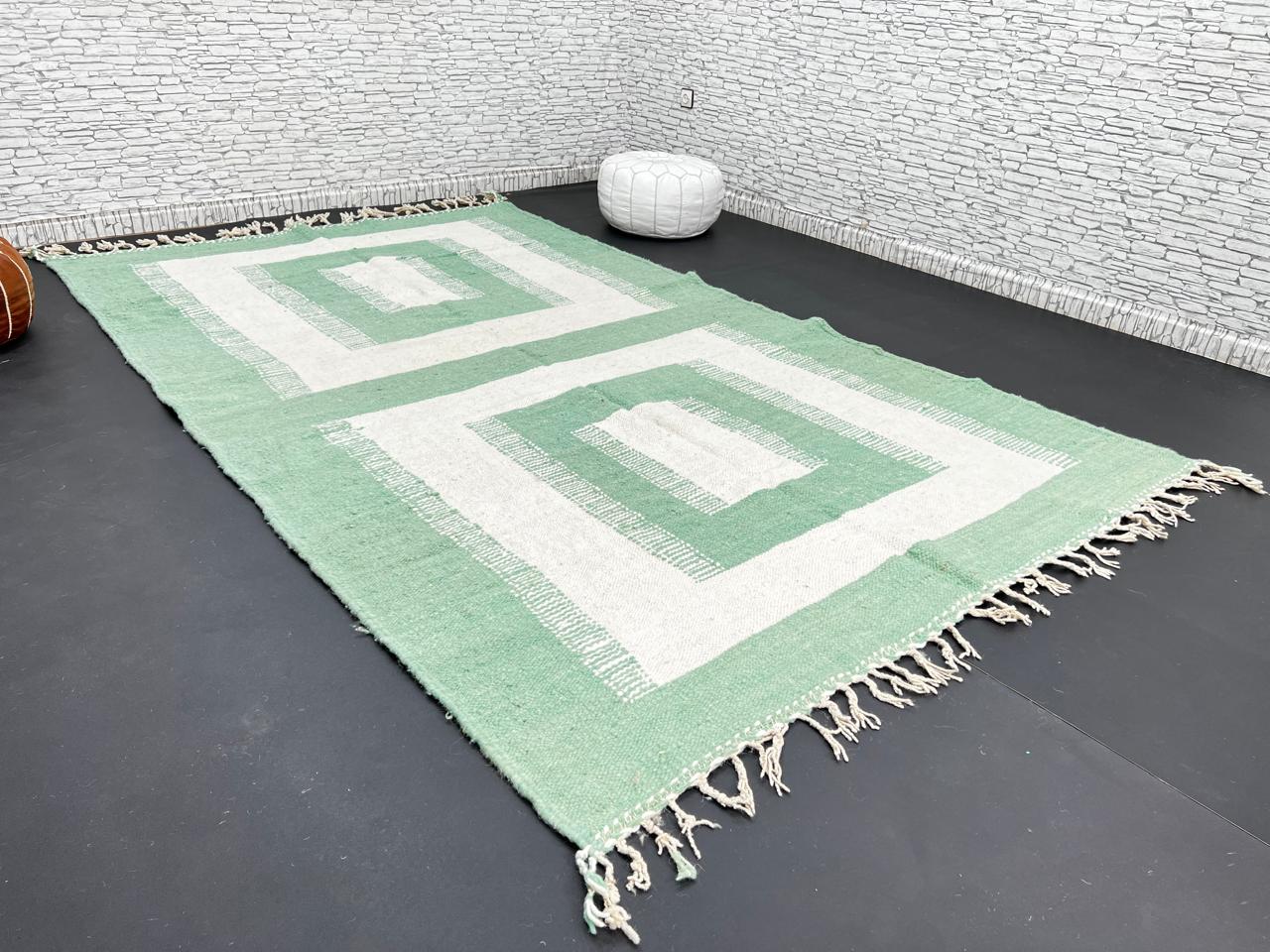Handwoven Moroccan wool rug in green and cream white with geometric square pattern – modern flatweave Berber carpet