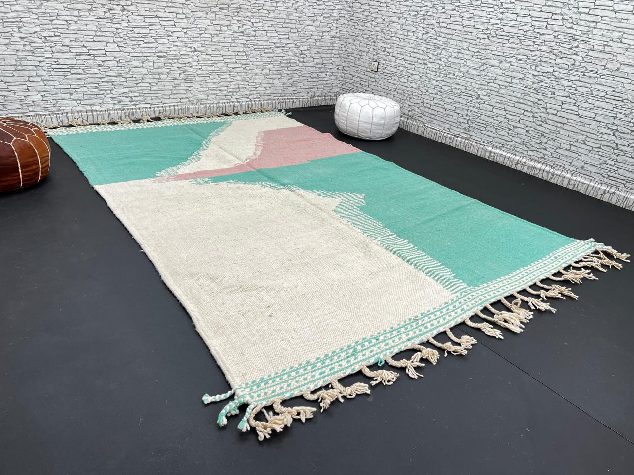 Handwoven by Berber women in Morocco from 100% natural sheep wool, this rug features a mint green body, soft rose accent, and a neutral beige background — a fresh and elegant color combination that brings warmth and calm to any living space.