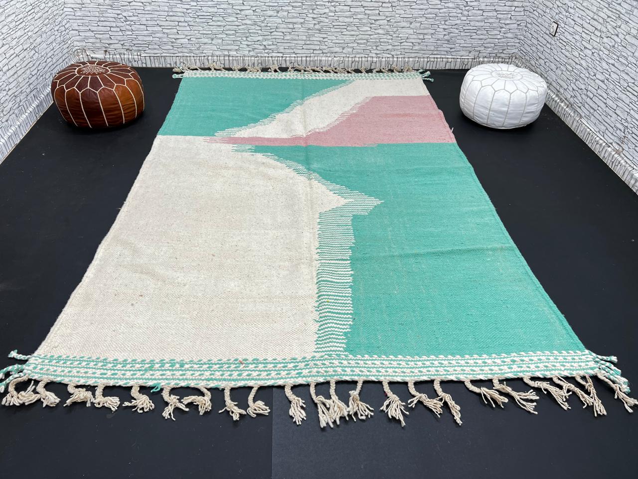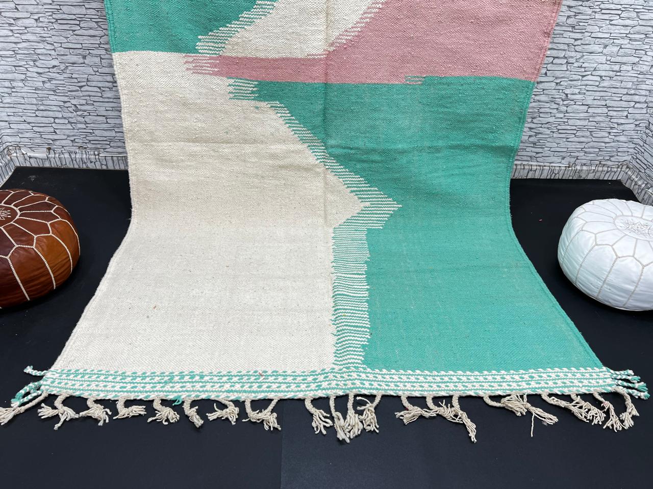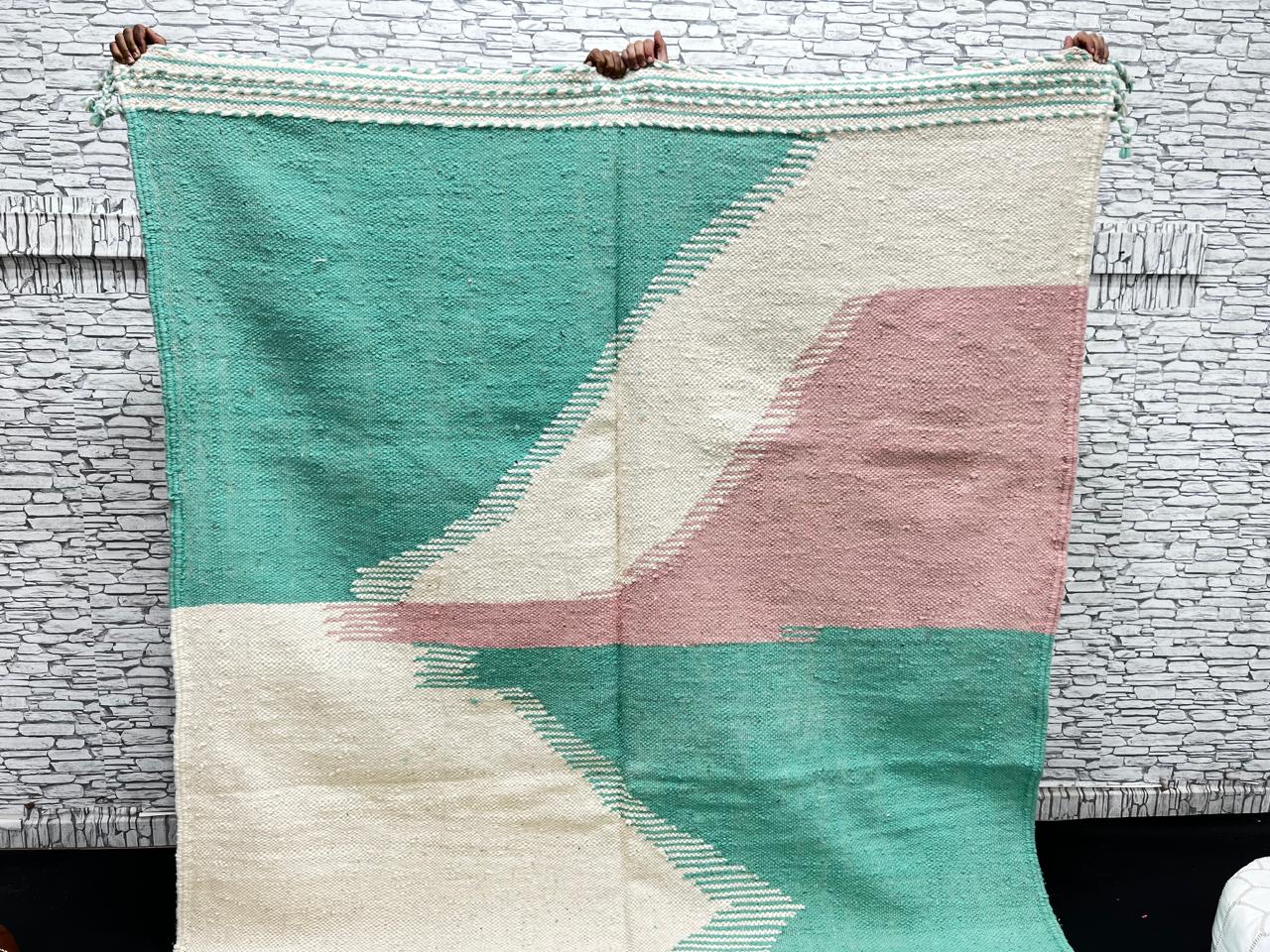 Mint Green & Rose Flatweave Moroccan Rug – Handmade Wool Kilim