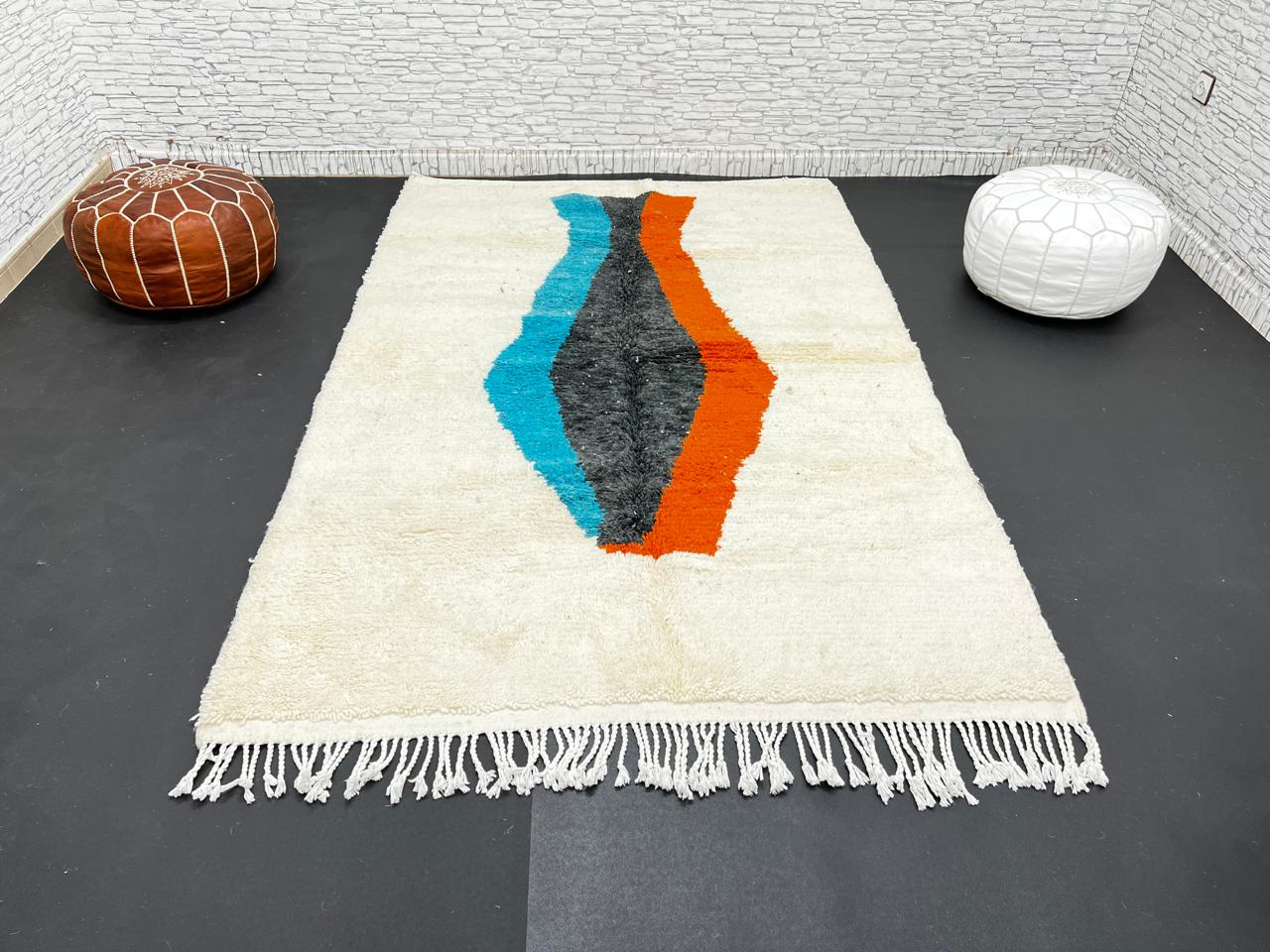 Modern Moroccan Wool Rug – Beige with Blue, Black & Orange Art Design