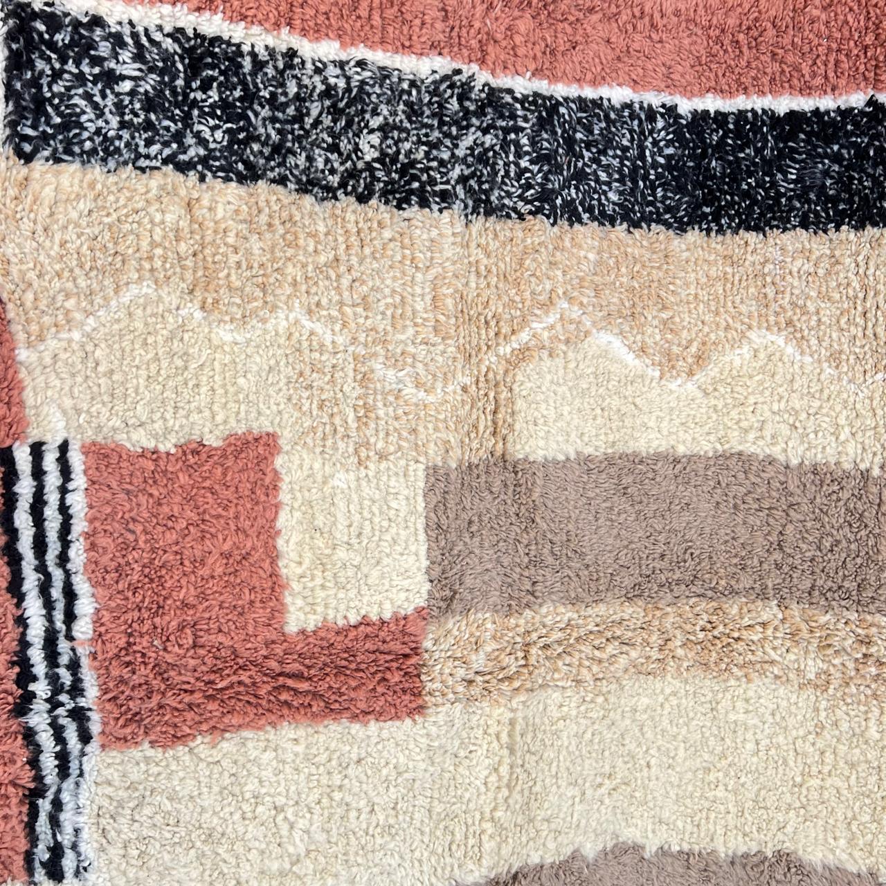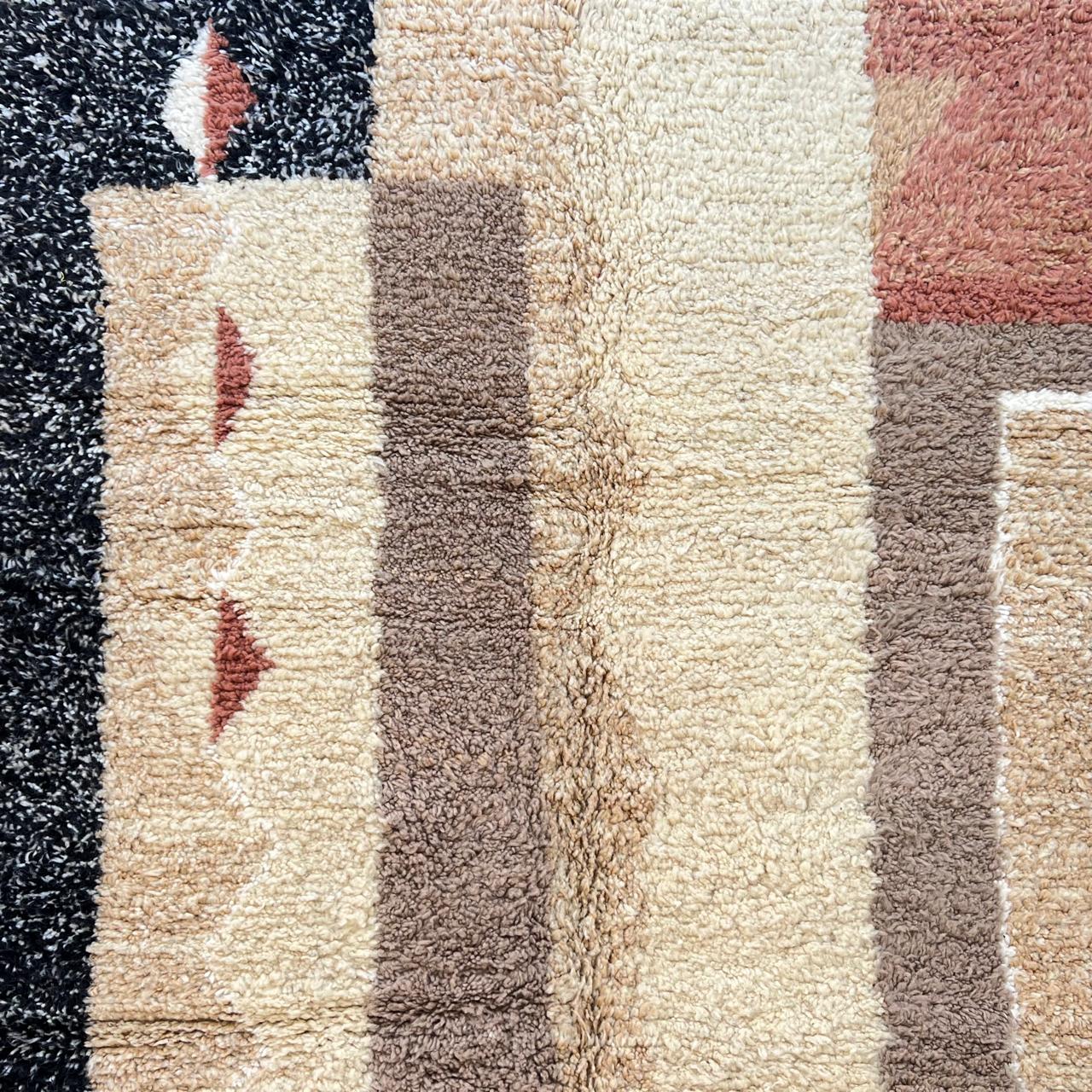 The design features a harmonious mix of soft beige, warm sand, terracotta, and deep black tones, arranged in abstract geometric forms inspired by Berber symbolism. These motifs carry cultural meaning while offering a modern, artistic look that fits effortlessly into both minimalist and bohemian interiors.