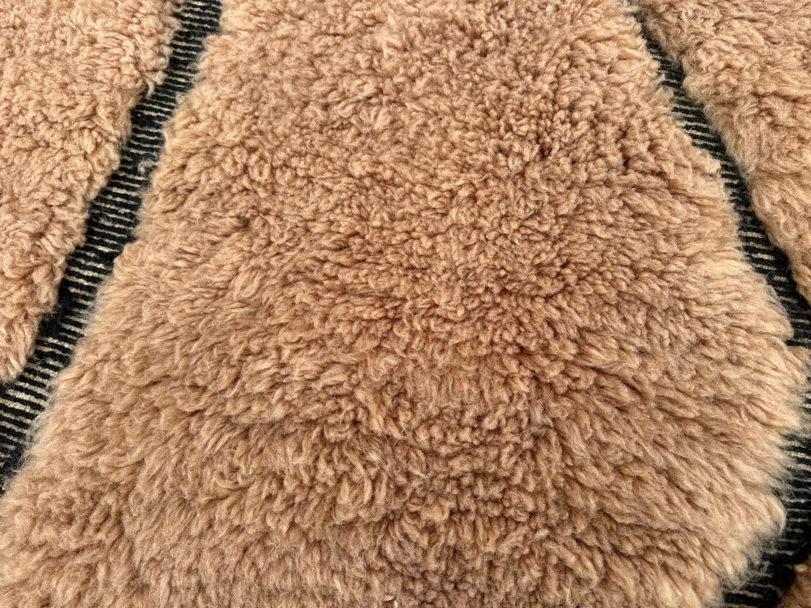 This handmade Moroccan runner rug features a warm camel-beige wool base enhanced with carved black Berber lines that create depth, contrast, and a sculptural texture. The carved motifs are carefully hand-shaved into the wool pile, giving the rug a refined, dimensional look that elevates its minimalist design.