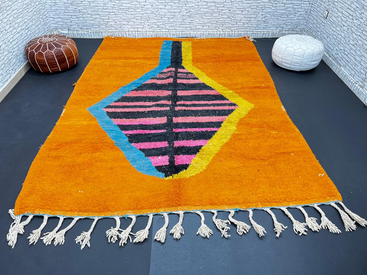 This Orange Moroccan Wool Rug is a bold and vibrant statement piece inspired by the artistic energy of Moroccan design. Handwoven by Berber artisans in the Atlas Mountains, it features a striking abstract geometric pattern with rich tones of orange, pink, black, blue, and yellow — symbolizing creativity and cultural harmony.