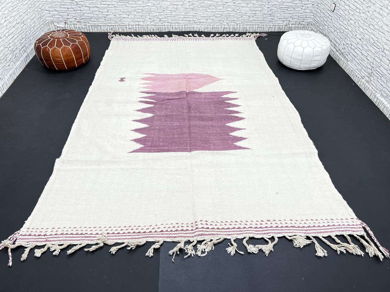 Woven from 100% natural sheep wool, this flatweave rug features a cream-white background accented by soft pink and deep purple geometric patterns. The minimalist yet artistic design reflects traditional Berber symbolism, representing harmony and cultural heritage.