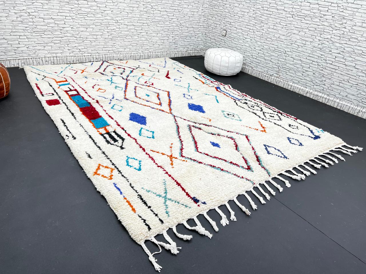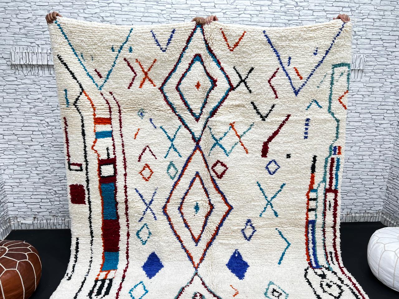 White Moroccan Wool Rug with Blue, Red & Orange Motifs – Handmade Berber Carpet