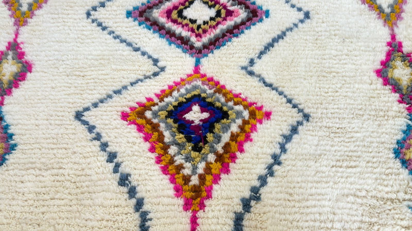 Discover the beauty of this hand knotted Moroccan rug, crafted with care by Berber women in the Atlas Mountains. This Azilal wool rug features bold diamond motifs in vibrant pinks, blues, yellows, and earthy tones on a natural cream background. Its colorful design and intricate weaving make it a standout piece for any space.