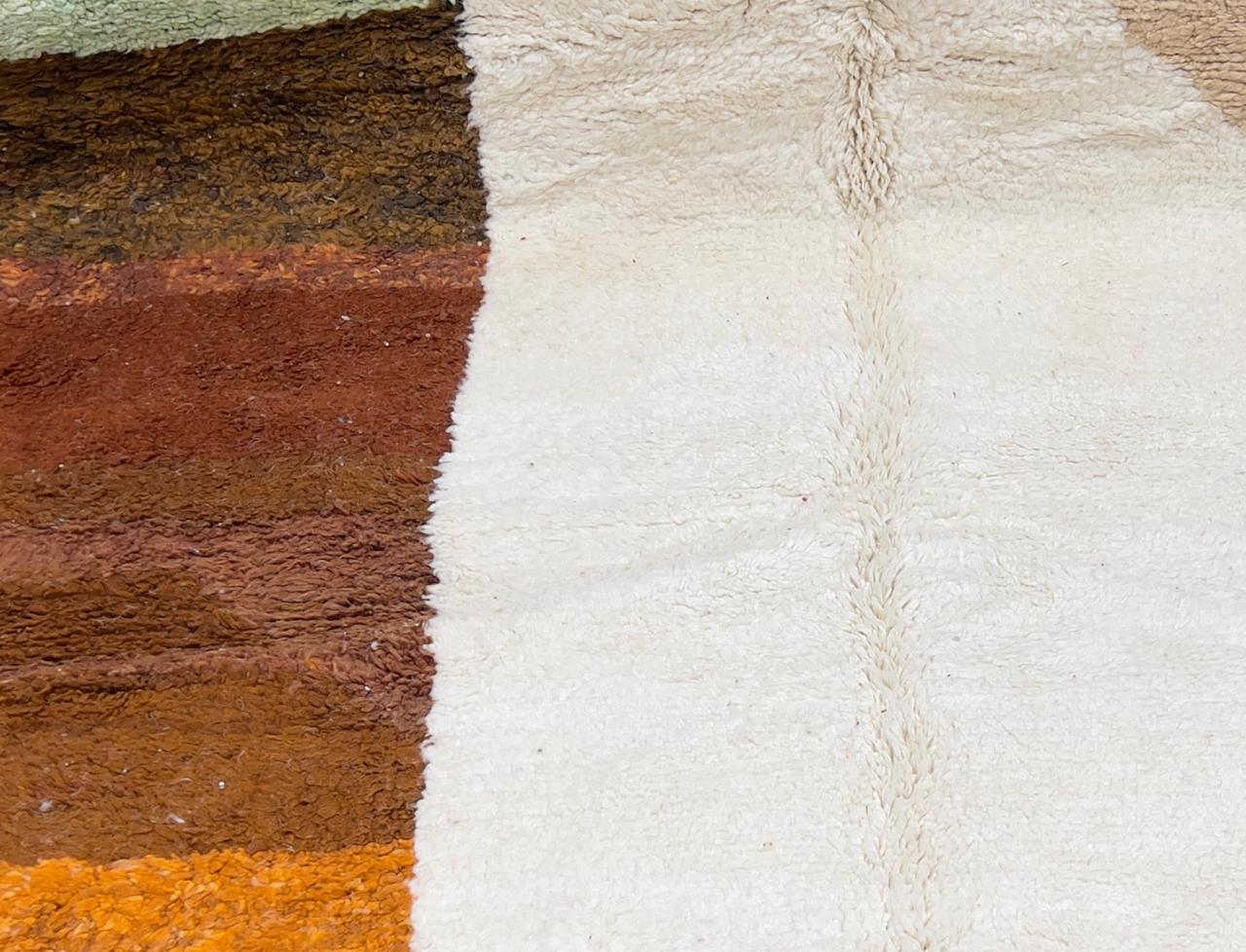 Bring warmth and modern artistry to your home with this soft Moroccan wool rug, handmade in a stylish geometric design. The gentle tones of green, beige, pink, brown, and orange create a calm and inviting look that blends beautifully with any décor.