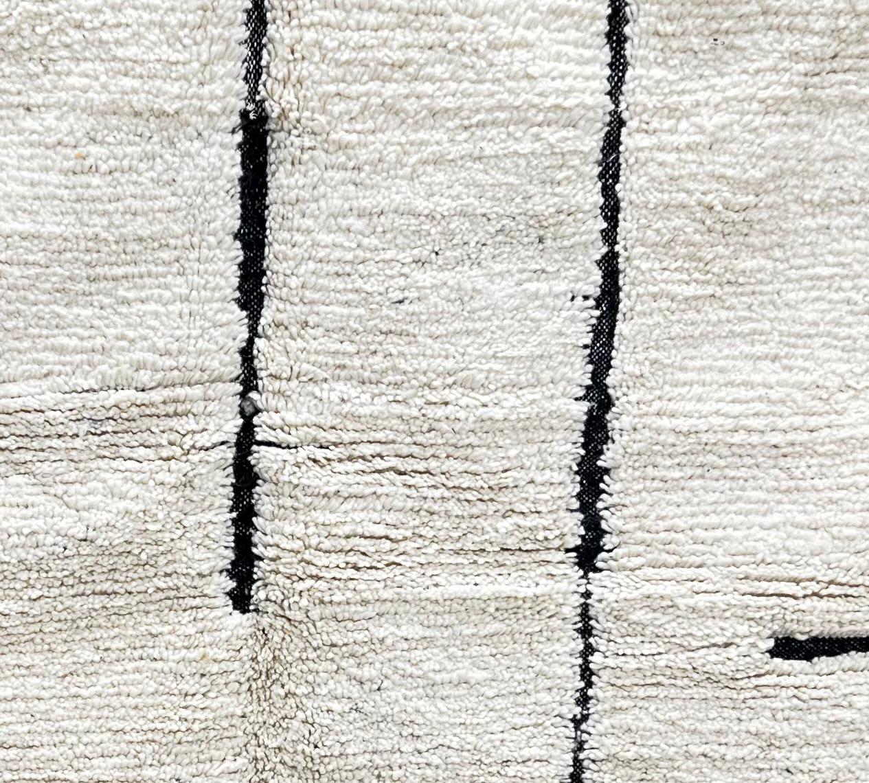Bring a clean and modern Berber aesthetic into your home with this round Moroccan rug featuring bold, abstract black linework on a soft cream-white base. The minimalist linear pattern adds sophistication while maintaining the traditional handmade charm of Moroccan craftsmanship.