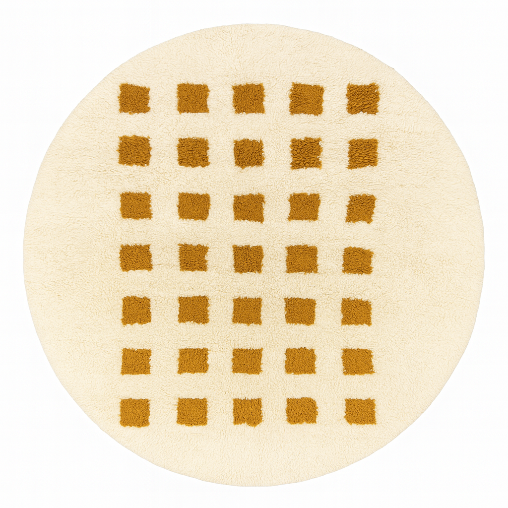 Add warmth and artisan charm to your home with this round Moroccan wool rug featuring a mustard yellow checker pattern on a soft cream base. Handwoven by Moroccan artisans, this handmade Moroccan rug blends minimal design with a bold, modern touch — perfect for living rooms, bedrooms, or cozy reading corners.