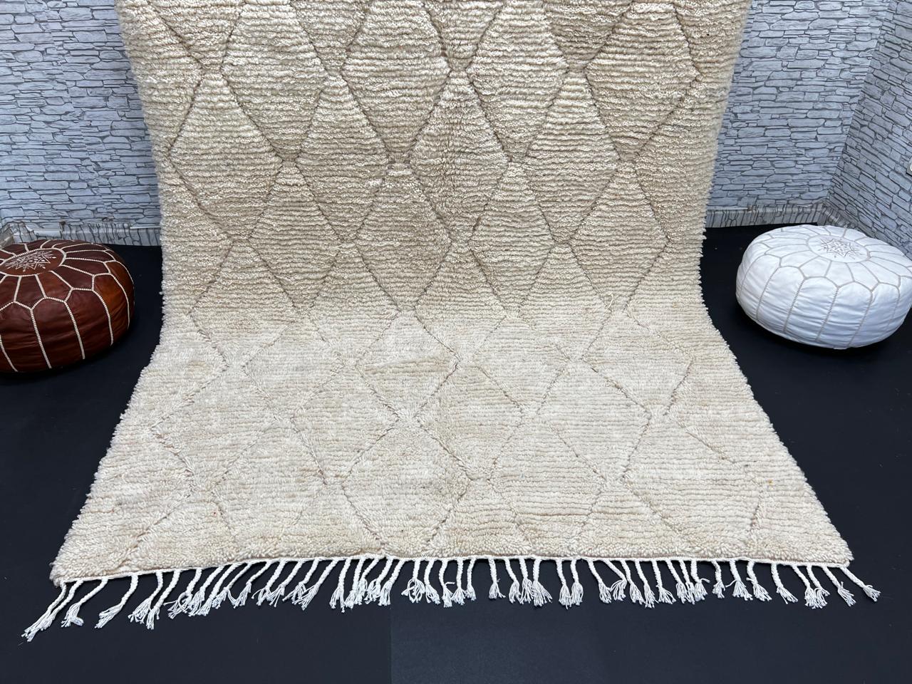 This Cream Beni Mrirt Wool Rug is a true masterpiece of Moroccan craftsmanship — handwoven by Berber women artisans in the Middle Atlas Mountains. Featuring a luxurious plush texture and a raised diamond pattern, this rug embodies the perfect balance between modern minimalism and timeless Berber heritage.