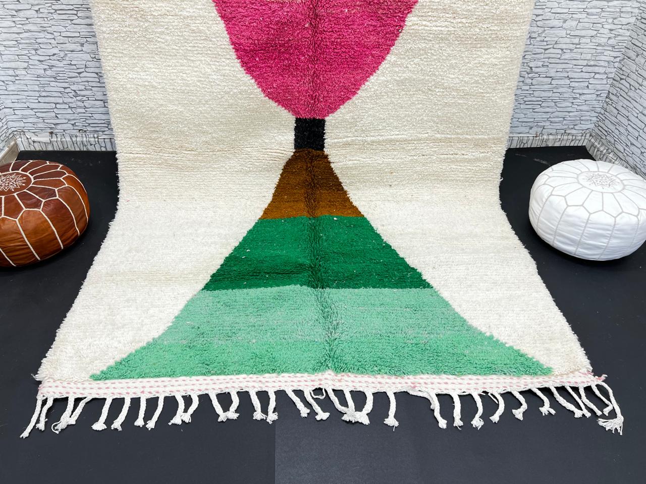 This Modern Moroccan Wool Rug features a bold and artistic hourglass design symbolizing balance and harmony. Handwoven by Berber artisans in the Atlas Mountains, it combines vibrant pink and green hues divided by a central black accent on a natural cream background — a perfect fusion of minimalist geometry and Moroccan artistry.