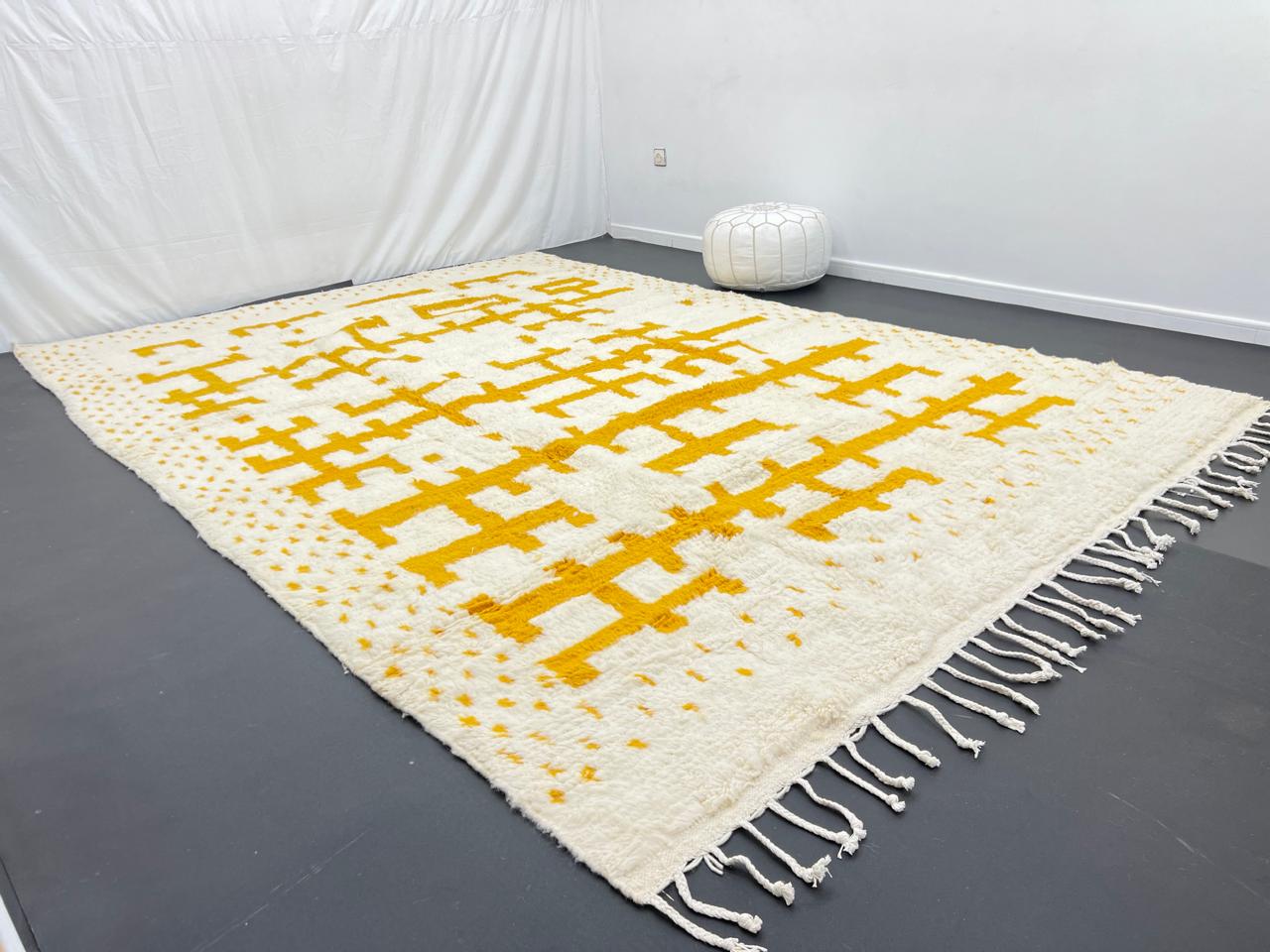 This handmade white Moroccan wool rug features a refined geometric symbol pattern inspired by traditional Berber motifs, carefully woven in warm yellow tones over a clean natural white base. Handcrafted by skilled artisans in Morocco using 100% natural wool, this rug balances cultural heritage with a fresh, contemporary aesthetic.