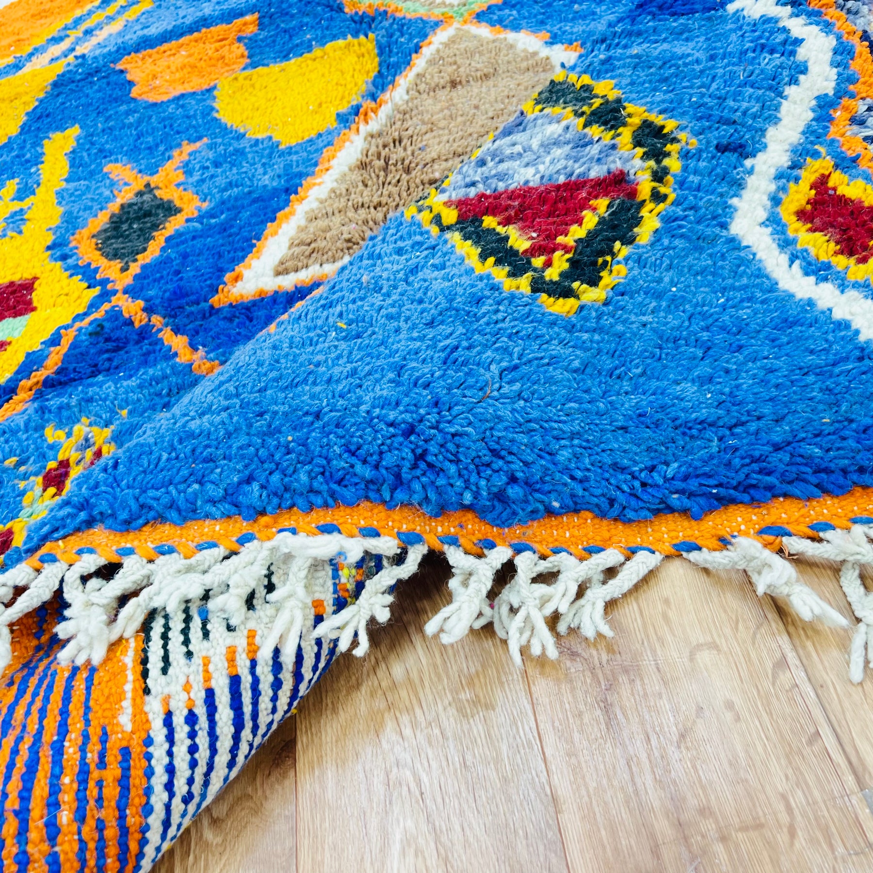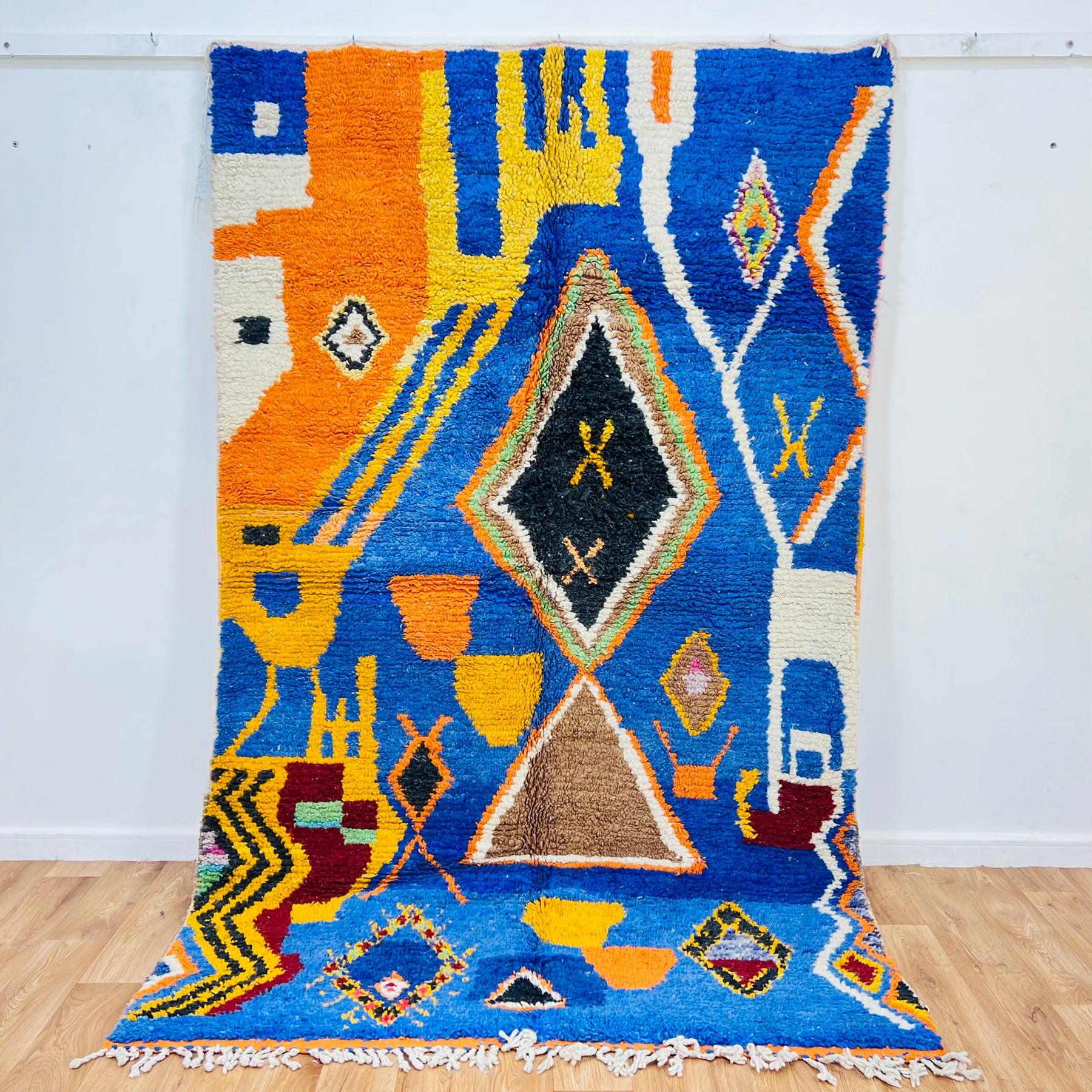 Bring a burst of vibrant color and tribal charm into your space with this stunning handmade vintage Moroccan rug. Rug 639 features a lively palette of cobalt blue, burnt orange, black, and white with rich Berber symbols including bold diamonds, tribal pots, and abstract shapes. The centerpiece showcases a striking diamond medallion framed by colorful accents that bring joyful energy to any room.