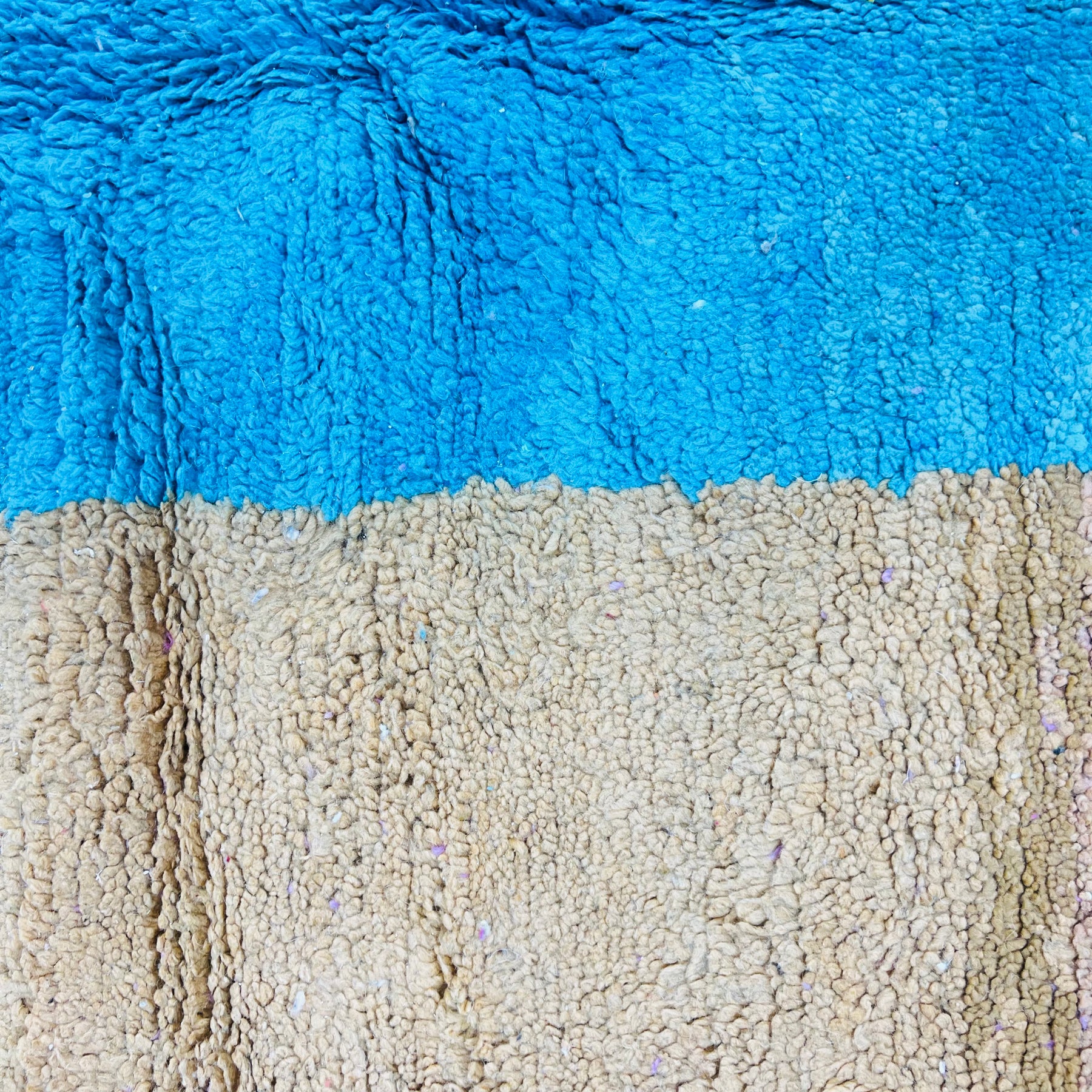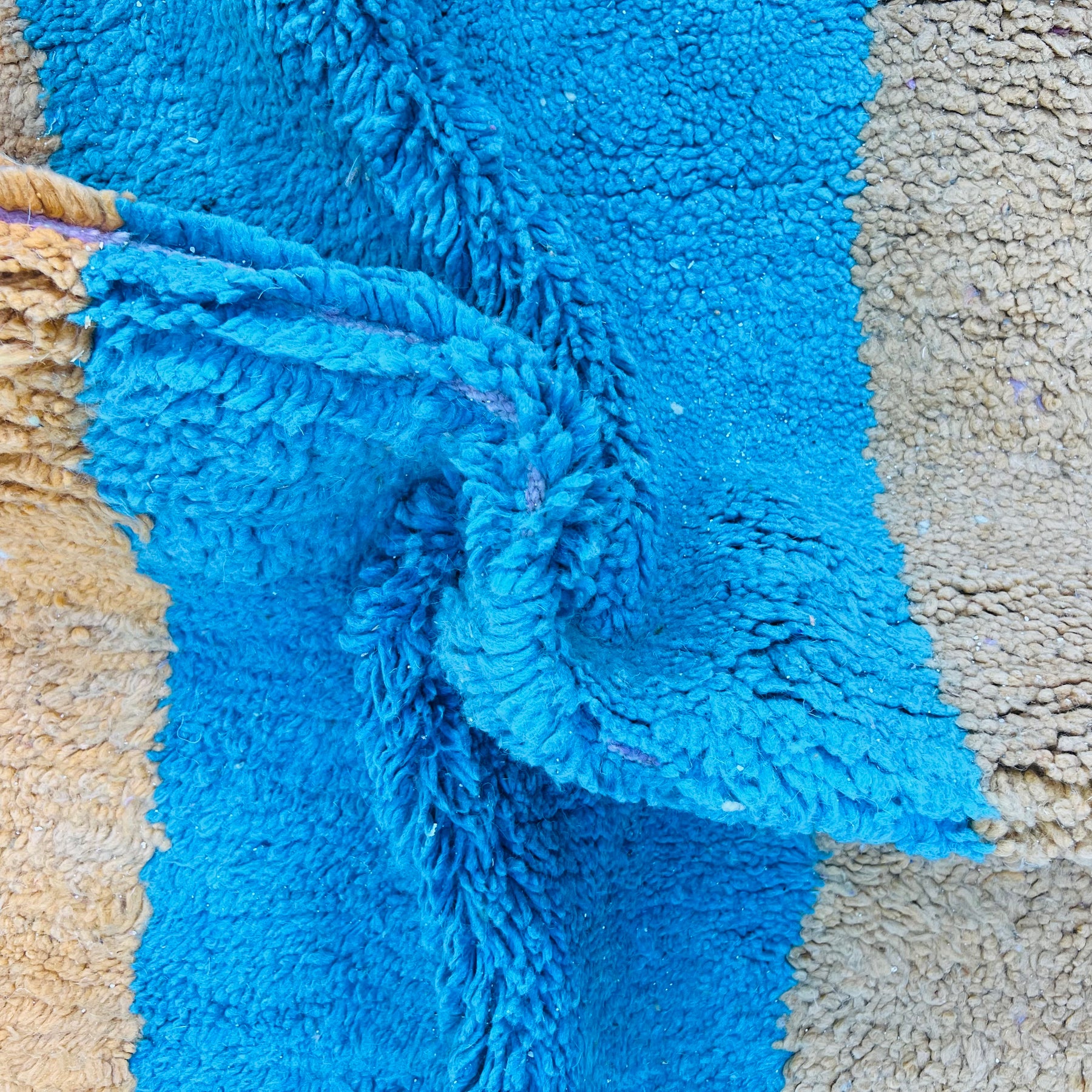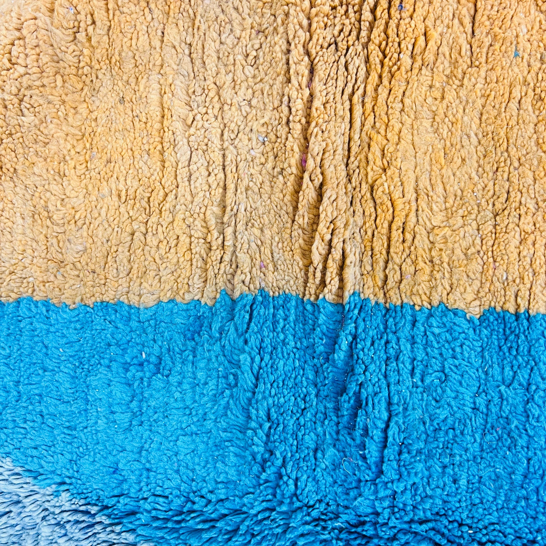 This bold and modern vintage Moroccan rug (Rug 586) showcases a captivating color block design in warm mustard, bright turquoise, and orange hues. Handwoven by skilled Berber artisans using 100% wool, this piece reflects the timeless artistry of Morocco with a contemporary twist. The sharp lines and playful pink border give the rug a minimalist yet energetic presence, perfect for modern interiors, boho-inspired rooms, or eclectic spaces.