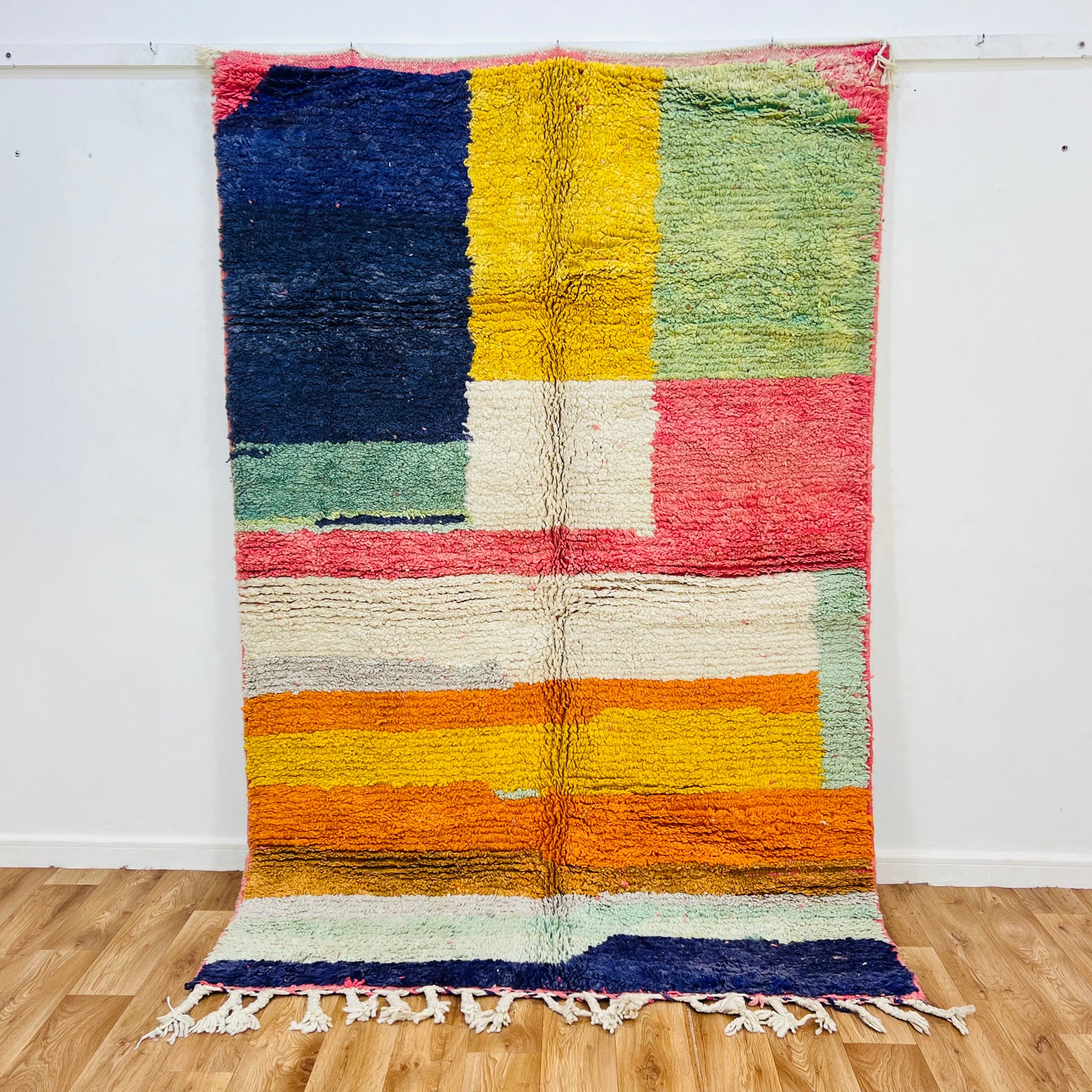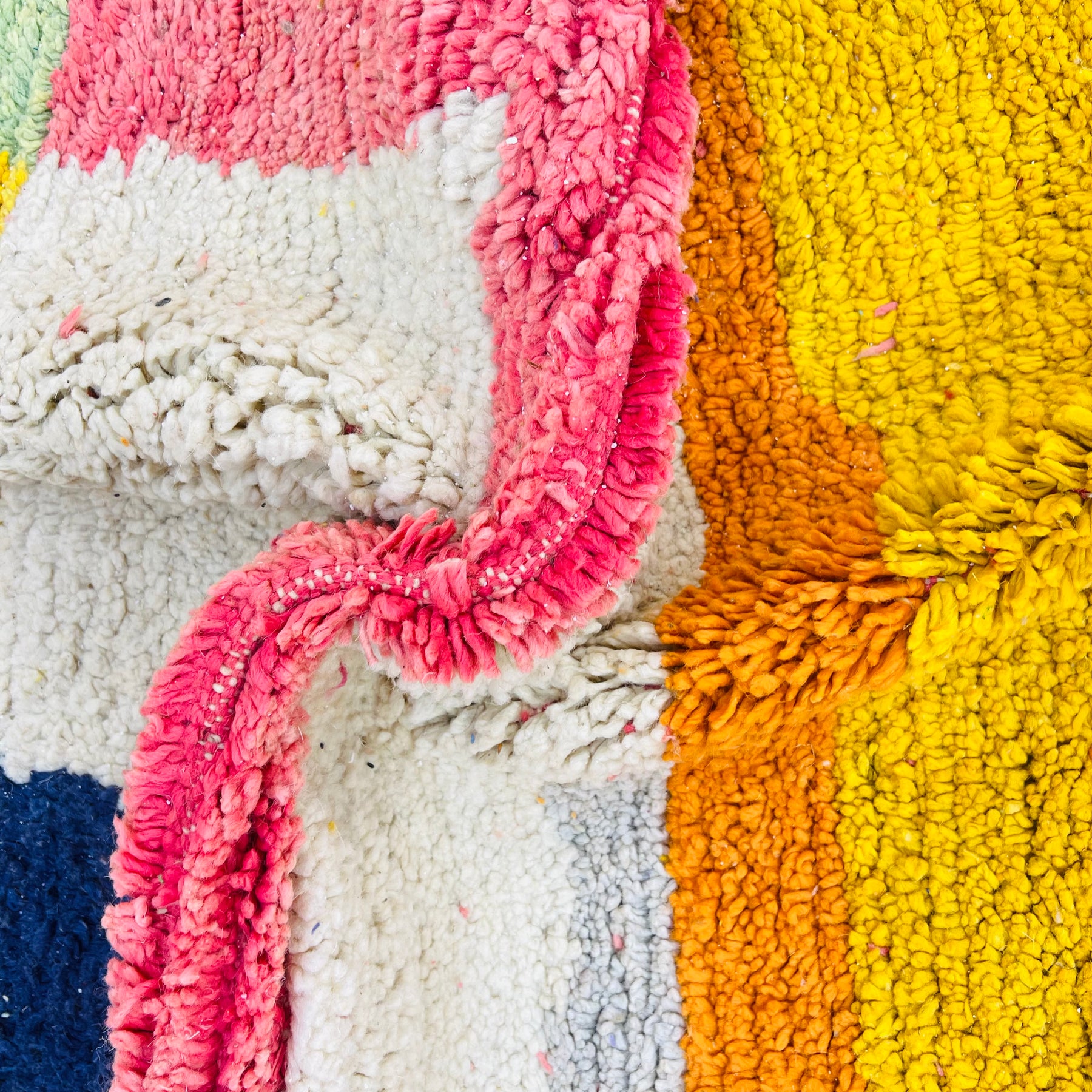 Close-up of colorful Moroccan wool rug with pink, green, yellow, and white patchwork design, perfect for boho interiors.