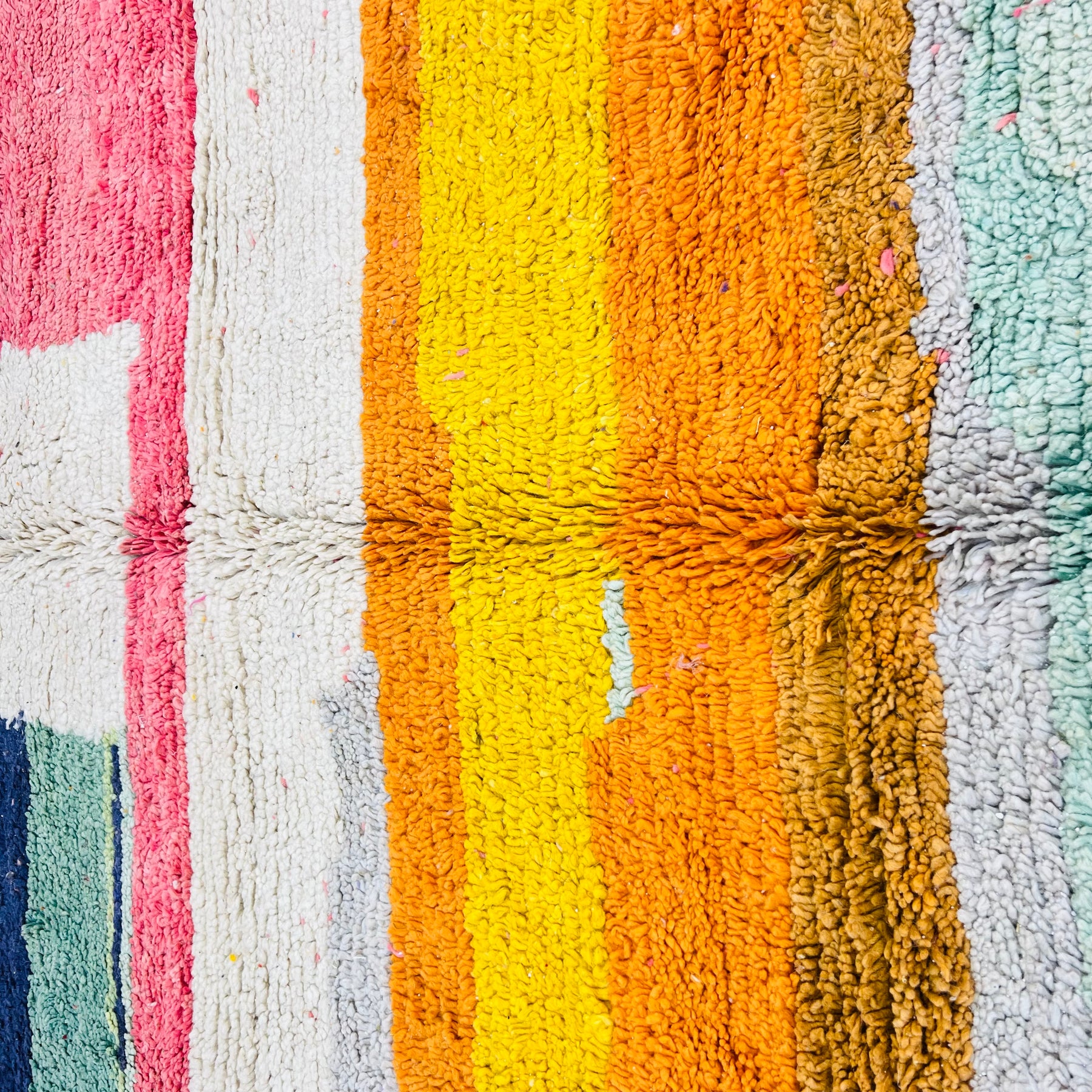 Close-up of colorful Moroccan wool rug texture with yellow, orange, and green stripes, showcasing vintage Berber craftsmanship.